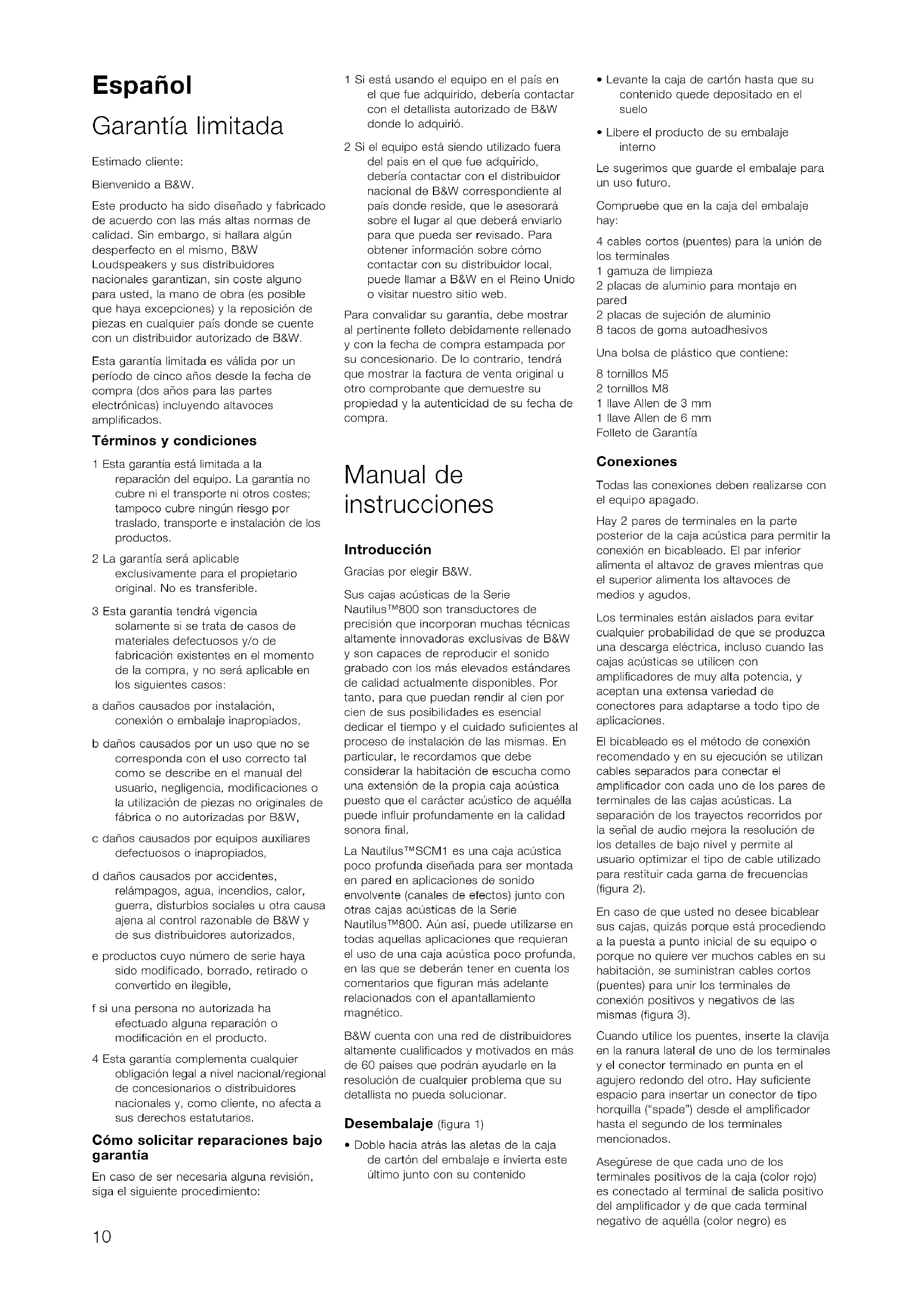 - Libere el producto de su embalaje interno Le sugerimos que guarde el embalaje para un uso futuro. Compruebe que en la caja del embalaje hay: 4 cables cortos (puentes) para la unión de los terminales 1 gamuza de limpieza 2 placas de aluminio para montaje en pared 2 placas de sujeción de aluminio 8 tacos de goma autoadhesivos Una bolsa de plástico que contiene: 8 tornillos M5 2 tornillos M8 1 llave Allen de 3 mm 1 llave Allen de 6 mm Folleto de Garantía Conexiones Todas las conexiones deben realizarse con el equipo apagado. Hay 2 pares de terminales en la parte posterior de la caja acústica para permitir la conexión en bicableado. El par inferior alimenta el altavoz de graves mientras que el superior alimenta los altavoces de medios y agudos. Los terminales están aislados para evitar cualquier probabilidad de que se produzca una descarga eléctrica, incluso cuando las cajas acústicas se utilicen con amplificadores de muy alta potencia, y aceptan una extensa variedad de conectores para adaptarse a todo tipo de aplicaciones. El bicableado es el método de conexión recomendado y en su ejecución se utilizan cables separados para conectar el amplificador con cada uno de los pares de terminales de las cajas acústicas. La separación de los trayectos recorridos por la señal de audio mejora la resolución de los detalles de bajo nivel y permite al usuario optimizar el tipo de cable utilizado para restituir cada gama de frecuencias (figura 2). En caso de que usted no desee bicablear sus cajas, quizás porque está procediendo a la puesta a punto inicial de su equipo o porque no quiere ver muchos cables en su habitación, se suministran cables cortos (puentes) para unir los terminales de conexión positivos y negativos de las mismas (figura 3). Cuando utilice los puentes, inserte la clavija en la ranura lateral de uno de los terminales y el conector terminado en punta en el agujero redondo del otro. Hay suficiente espacio para insertar un conector de tipo horquilla (“spade”) desde el amplificador hasta el segundo de los terminales mencionados. Asegúrese de que cada uno de los terminales positivos de la caja (color rojo) es conectado al terminal de salida positivo del amplificador y de que cada terminal negativo de aquélla (color negro) es 10conectado al terminal de salida negativo del amplificador. Una conexión incorrecta puede provocar una imagen sonora pobre y pérdidas en la respuesta en graves. Cuando bicablee, no utilice los puentes. Preste una atención especial a la polaridad de las distintas conexiones ya que una conexión incorrecta también puede perjudicar la respuesta en frecuencia del filtro de medios/graves y, si los puentes no se quitan, puede dañar el amplificador como consecuencia de la unión de sus terminales de salida. Colocación Asegúrese de que la posición elegida para instalar la caja acústica es la mejor posible antes de fijar el soporte de montaje a la pared. Campos magnéticos dispersos Los altavoces contenidos en las cajas acústicas generan campos magnéticos dispersos que se extienden más allá de las fronteras del recinto. Le recomendamos que aleje los objetos magnéticamente sensibles (pantallas de televisión, monitores de ordenador, discos flexibles, cintas de audio y vídeo, tarjetas con banda magnética y cosas por el estilo) al menos 0,5 m de la caja acústica. Por esta razón, sólo se recomienda utilizar la Nautilus™SCM1 para el canal central de sistemas de A/V cuando se usen sistemas de proyección de imágenes insensibles a los campos magnéticos dispersos (por ejemplo pantallas de plasma o LCD). Cine en Casa Como una caja acústica con sonido surround Hay dos maneras básicas de presentar la información de sonido envolvente. Las bandas sonoras cinematográficas más antiguas, donde la información de sonido envolvente fue grabada en un único canal, se beneficiaban de una presentación sonora muy envolvente gracias a las cajas acústicas de efectos, aunque se esforzaban muy poco para mejorar la imagen sonora lateral y posterior. Las más modernas – tanto de audio como de A/V – grabaciones de 5.1 canales incorporan dos canales – izquierdo y derecho – de sonido envolvente completamente separados que permiten reconstruir una imagen sonora mucho más precisa. No obstante, las imágenes obtenidas en las escenas laterales y posterior suelen ser menos precisas que las correspondientes a la escena frontal. Los tonos sostenidos pueden posicionarse de un modo más sencillo entre las cajas acústicas que los sonidos percusivos, que tienden a colapsarse en aquéllas. También resulta difícil mantener la posición de la imagen sonora para todos los oyentes si el área de escucha ocupa una porción significativa de la superficie delimitada por las cinco cajas acústicas del sistema. La estabilidad de dicha imagen depende de la consecución o no del balance correcto entre las citadas cajas y además el efecto de “punto de escucha crítico” es en este caso incluso más marcado que con audio de dos canales. Teniendo lo anterior en mente, su éxito a la hora de recrear las intenciones del productor de la película visionada en lo que al campo sonoro envolvente se refiere dependerá en gran parte de condicionantes de tipo doméstico, como por ejemplo la libertad de la que usted disponga para colocar las cajas acústicas en una posición ideal y el número de espectadores a los que se desee llegar con respecto al tamaño de la sala. No hay ningún estándar establecido por la industria en lo que respecta al ángulo de orientación de las cajas acústicas en la posición de escucha pero la mayoría de grabaciones son realizadas con las citadas cajas ubicadas entre 110° y 130° con respecto a la posición frontal central. Coloque las cajas acústicas contra la pared teniendo en cuenta el anterior margen de ángulos aunque inicialmente ubíquelas sobre un soporte provisional que sitúe los altavoces de agudos de las mismas aproximadamente