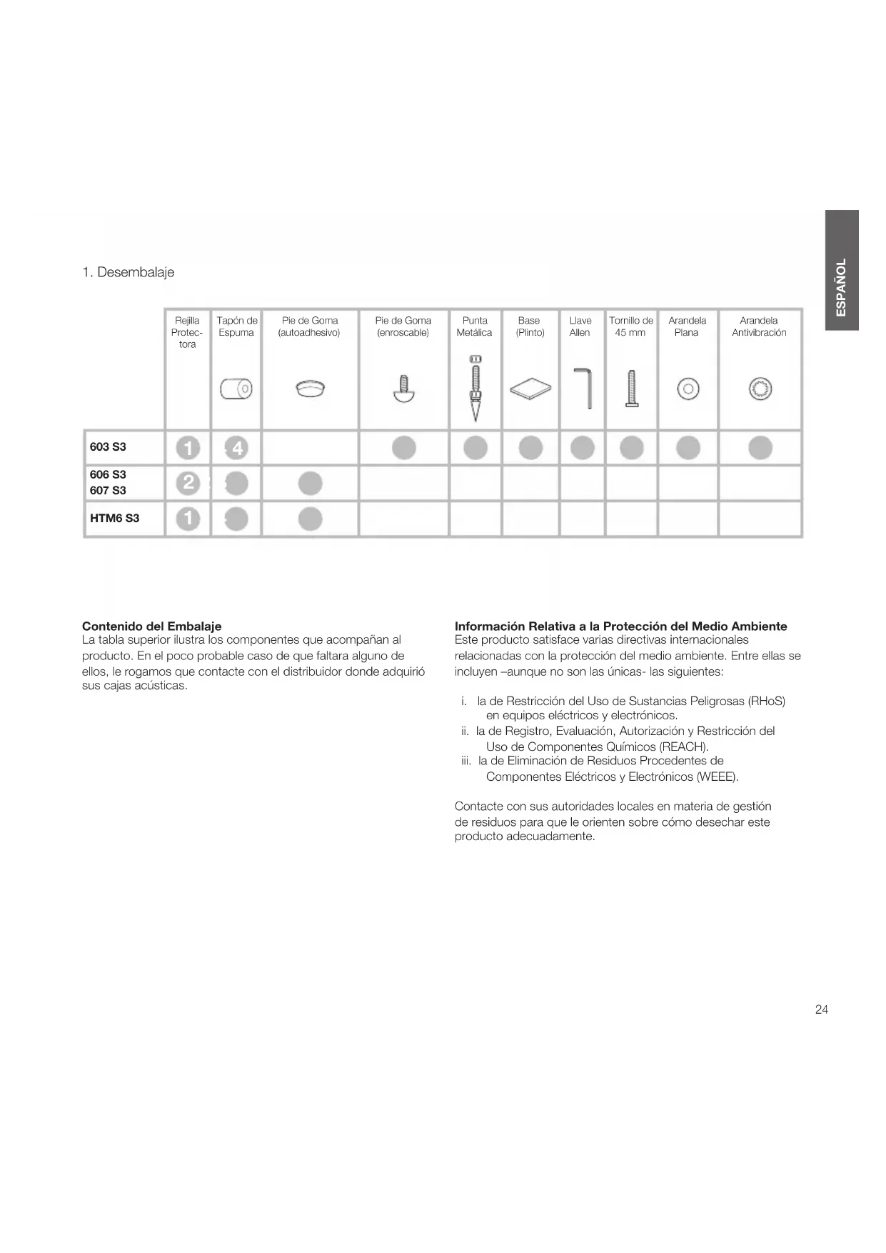 ESPAÑOL Contenido del Embalaje La tabla superior ilustra los componentes que acompañan al producto. En el poco probable caso de que faltara alguno de ellos, le rogamos que contacte con el distribuidor donde adquirió sus cajas acústicas. Información Relativa a la Protección del Medio Ambiente Este producto satisface varias directivas internacionales relacionadas con la protección del medio ambiente. Entre ellas se incluyen –aunque no son las únicas- las siguientes: