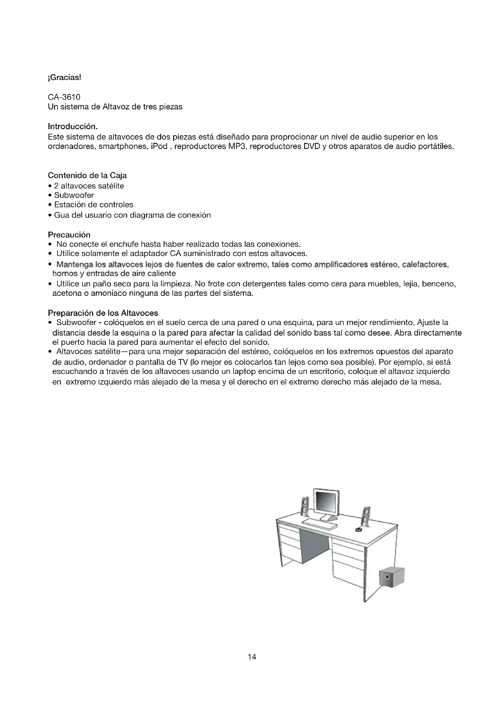 - Altavoces satélite—para una mejor separación del estéreo, colóquelos en los extremos opuestos del aparato de audio, ordenador o pantalla de TV (lo mejor es colocarlos tan lejos como sea posible). Por ejemplo, si está escuchando a través de los altavoces usando un laptop encima de un escritorio, coloque el altavoz izquierdo en extremo izquierdo más alejado de la mesa y el derecho en el extremo derecho más alejado de la mesa.15 Conexión de los Altavoces: Puede contactar estos altavoces a una variedad de aparatos, tales como laptops, ordenadores, smartphones, iPod, reproductores MP3, reproductores de CD, reproductores de DVD, y otros aparatos audio. Por favor, lea las más a su fuente de alimentación. Ordenador de mesa: