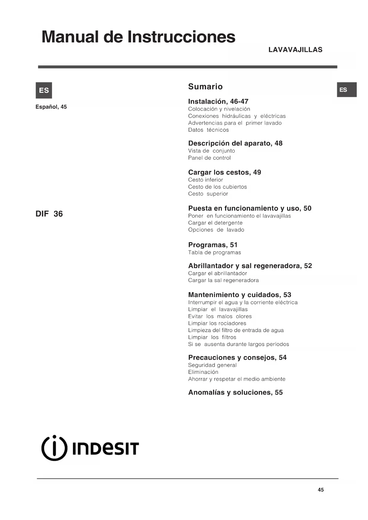 Manual de Instrucciones Sumario Instalación, 46-47 Colocación y nivelación Conexiones hidráulicas y eléctricas Advertencias para el primer lavado Datos técnicos Descripción del aparato, 48 Vista de conjunto Panel de control Cargar los cestos, 49 Cesto inferior Cesto de los cubiertos Cesto superior Puesta en funcionamiento y uso, 50 Poner en funcionamiento el lavavajillas Cargar el detergente Opciones de lavado Programas, 51 Tabla de programas Abrillantador y sal regeneradora, 52 Cargar el abrillantador Cargar la sal regeneradora Mantenimiento y cuidados, 53 Interrumpir el agua y la corriente eléctrica Limpiar el lavavajillas Evitar los malos olores Limpiar los rociadores Limpieza del filtro de entrada de agua Limpiar los filtros Si se ausenta durante largos períodos Precauciones y consejos, 54 Seguridad general Eliminación Ahorrar y respetar el medio ambiente Anomalías y soluciones, 55