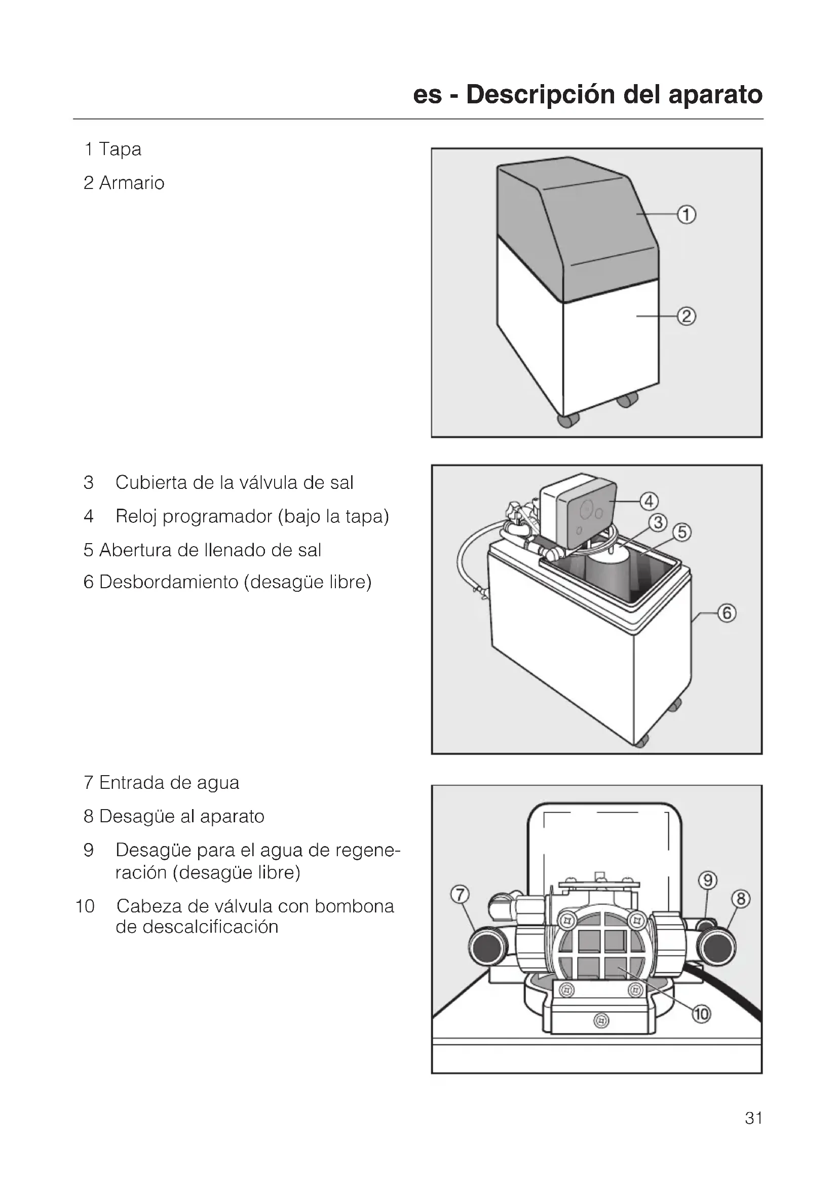 poración. El monodescalcificador está listo para el funcionamiento y suministra agua descalcificada. En caso de irregularidades póngase en contacto con el Servicio Post-Venta de Miele. es - Indicaciones de manejo 36Medidas exteriores: Altura 572 / Anchura 230 / Profundidad 400 mm Conexión agua dura/blanda: R 3/4" Bombona de descalcificación: Pieza6x13" Contenido de resina: 4 l +/- 10 % Sybron Chemicals - Dow Chemical Comp. Potencia: 15 l/min (momentáneo 20 l/min) Presión mínima de agua: sin/con descalcificador en máquinas de agua: 200 kPa (2,0 bar)/600 kPa (6,0 bar) sin/con descalcificador en máquinas de tanques: 200 kPa (2,0 bar)/600 kPa (6,0 bar) Presión estática máxima: 600 kPa (6,0 bar) Diferencia de presión: máx. 100 kPa (1 bar) a 10 l/min Temperatura: 4 °C - 65 °C Consumo de sal: 0,5 kg NaCl por regeneración +/- 10 % Consumo de agua: 55 l por regeneración +/- 10 % Tiempo de regeneración: 30 minutos +/- 10 % Capacidad/dif.: +/- 10 % Reserva de sal: 10 kg Forma de las bombonas: redonda, aprox.Ø=25mm,altura = 14 mm Tensión: véase placa de características de la clavija de alimentación Potencia nominal: véase placa de características de la clavija de alimentación Fusible véase placa de características de la clavija de alimentación