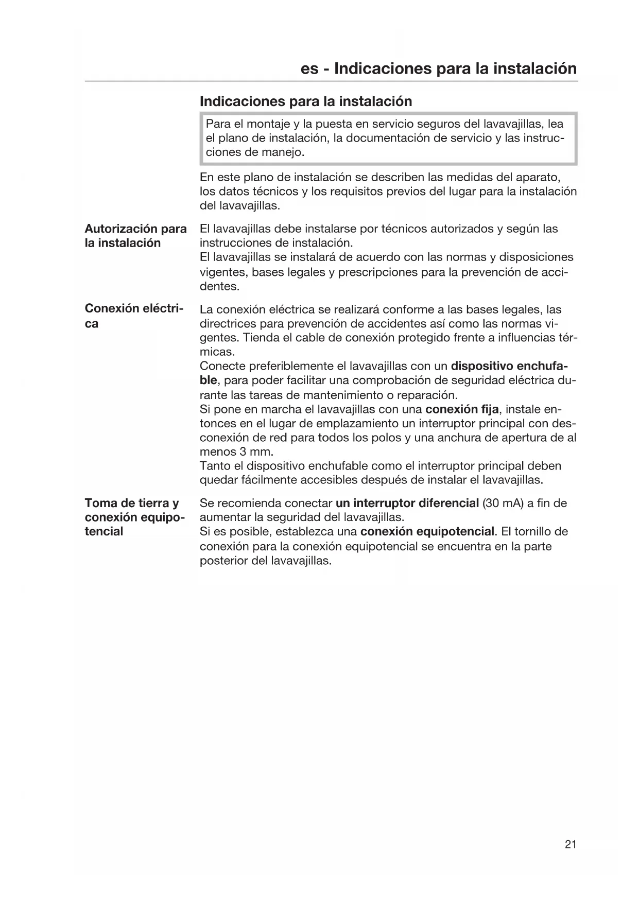 La conexión eléctrica se realizará conforme a las bases legales, las directrices para prevención de accidentes así como las normas vi- gentes. Tienda el cable de conexión protegido frente a influencias tér- micas. Conecte preferiblemente el lavavajillas con un dispositivo enchufa- ble, para poder facilitar una comprobación de seguridad eléctrica du- rante las tareas de mantenimiento o reparación. Si pone en marcha el lavavajillas con una conexión fija, instale en- tonces en el lugar de emplazamiento un interruptor principal con des- conexión de red para todos los polos y una anchura de apertura de al menos 3mm. Tanto el dispositivo enchufable como el interruptor principal deben quedar fácilmente accesibles después de instalar el lavavajillas. Toma de tierra y conexión equipo- tencial Se recomienda conectar un interruptor diferencial (30mA) a fin de aumentar la seguridad del lavavajillas. Si es posible, establezca una conexión equipotencial. El tornillo de conexión para la conexión equipotencial se encuentra en la parte posterior del lavavajillas.es - Indicaciones para la instalación