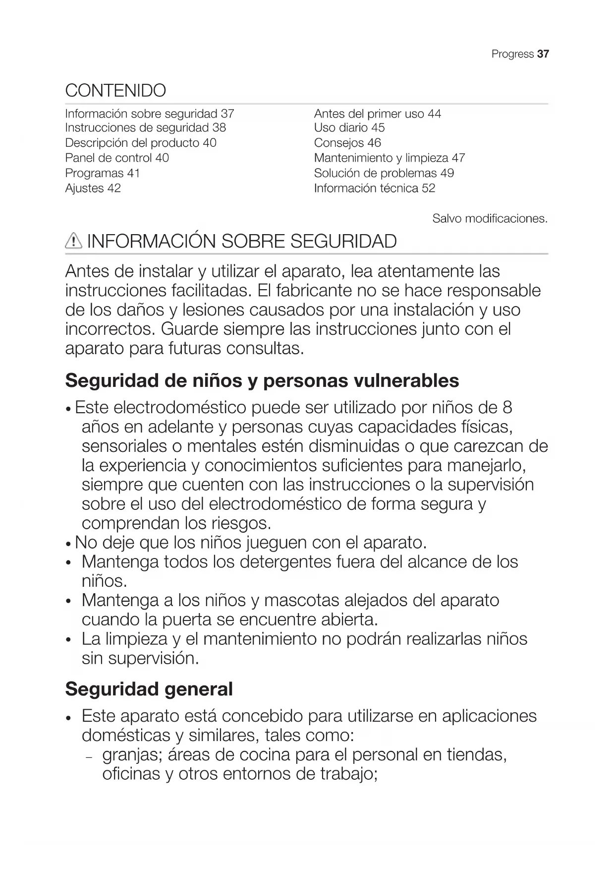 - Retire el pestillo de la puerta para evitar que los niños y las mascotas queden encerrados en el aparato. Progress 39DESCRIPCIÓN DEL PRODUCTO