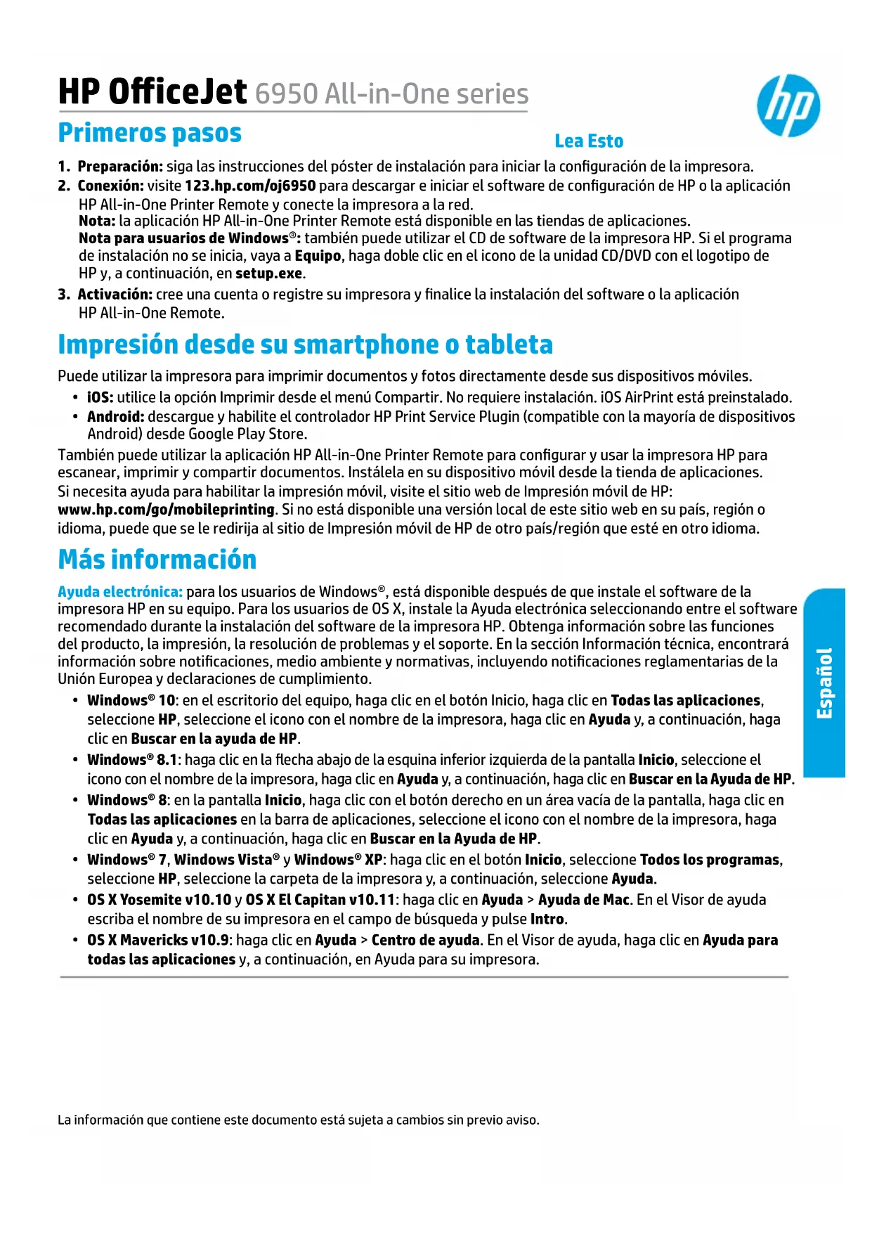 - Android: descargue y habilite el controlador HP Print Service Plugin (compatible con la mayoría de dispositivos Android) desde Google Play Store.También puede utilizar la aplicación HP All-in-One Printer Remote para congurar y usar la impresora HP para escanear, imprimir y compartir documentos. Instálela en su dispositivo móvil desde la tienda de aplicaciones. Si necesita ayuda para habilitar la impresión móvil, visite el sitio web de Impresión móvil de HP: www.hp.com/go/mobileprinting. Si no está disponible una versión local de este sitio web en su país, región o idioma, puede que se le redirija al sitio de Impresión móvil de HP de otro país/región que esté en otro idioma. Español Lea Esto14 Conexiones de redes inalámbricas Si sigue las instrucciones del panel de control de la impresora y de instalación del software de la impresora HP, habrá conectado correctamente la impresora a la red inalámbrica. Nota: si desea cambiar el tipo de conexión que utiliza la impresora (por ejemplo, de USB a inalámbrica o viceversa), debe utilizar las herramientas que se proporcionan con el software de la impresora HP. Para obtener más información, consulte “Cambio del tipo de conexión” en el archivo de Ayuda (consulte “Más información” en la página 13 de esta guía para obtener información sobre el archivo de Ayuda). Solución de problemas de comunicación inalámbrica