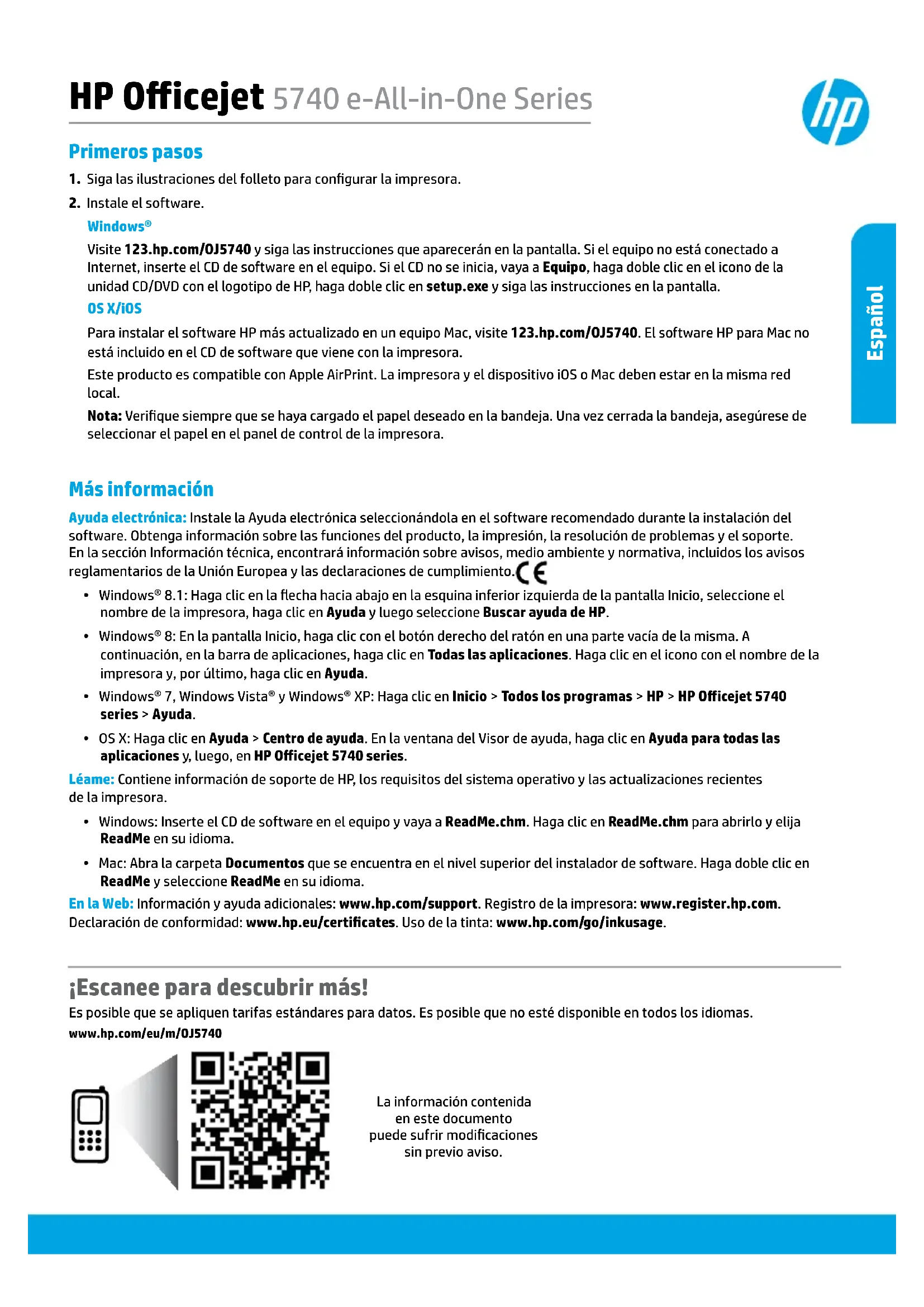 Visite 123.hp.com/OJ5740 y siga las instrucciones que aparecerán en la pantalla. Si el equipo no está conectado a Internet, inserte el CD de software en el equipo. Si el CD no se inicia, vaya a Equipo, haga doble clic en el icono de la unidad CD/DVD con el logotipo de HP, haga doble clic en setup.exe y siga las instrucciones en la pantalla. OS X/iOS Para instalar el software HP más actualizado en un equipo Mac, visite 123.hp.com/OJ5740. El software HP para Mac no está incluido en el CD de software que viene con la impresora.Este producto es compatible con Apple AirPrint. La impresora y el dispositivo iOS o Mac deben estar en la misma red local. Nota: Verique siempre que se haya cargado el papel deseado en la bandeja. Una vez cerrada la bandeja, asegúrese de seleccionar el papel en el panel de control de la impresora. HP Oicejet 5740 e-All-in-One Series www.hp.com/eu/m/OJ5740 Español Español42 Información de seguridad Tome siempre las precauciones básicas de seguridad cuando use esta impresora, así podrá reducir los riesgos de sufrir lesiones físicas como consecuencia de un incendio o una descarga eléctrica.