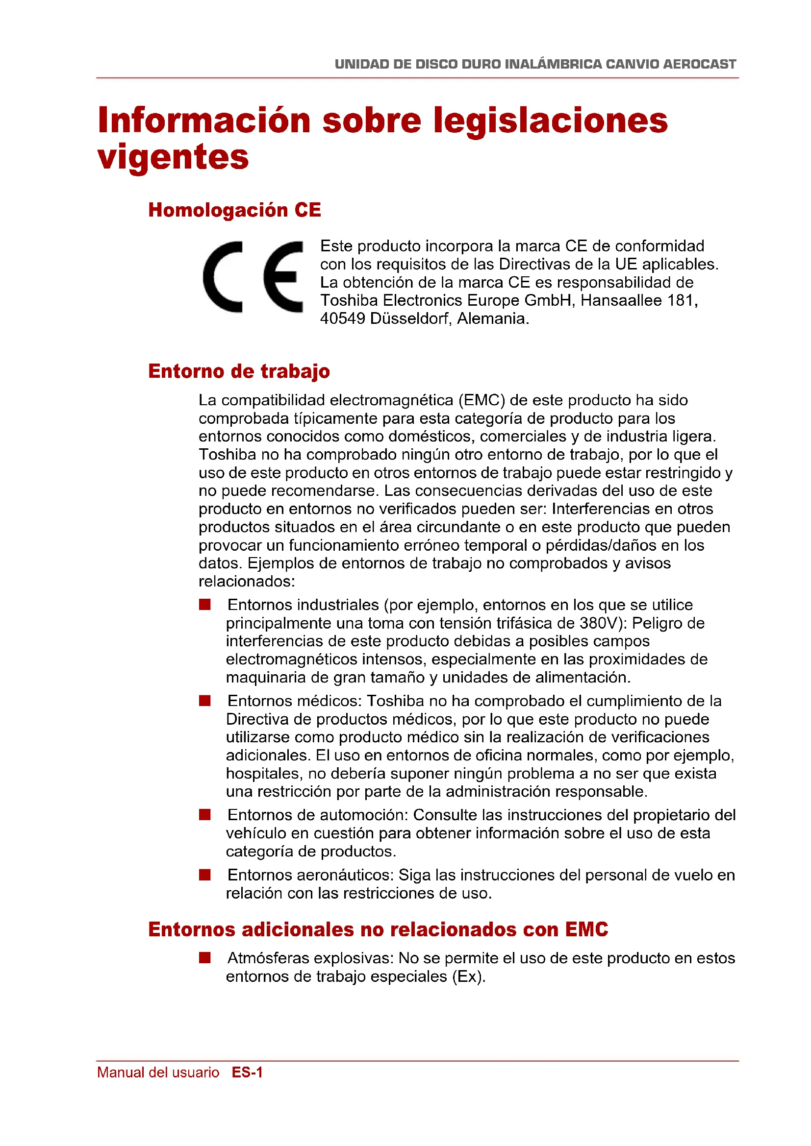Varemærker . . . . . . . . . . . . . . . 11Manual del usuario ES-1 UNIDAD DE DISCO DURO INALÁMBRICA CANVIO AEROCAST Manual del usuario Información sobre legislaciones vigentes Homologación CE Entorno de trabajo La compatibilidad electromagnética (EMC) de este producto ha sido comprobada típicamente para esta categoría de producto para los entornos conocidos como domésticos, comerciales y de industria ligera. Toshiba no ha comprobado ningún otro entorno de trabajo, por lo que el uso de este producto en otros entornos de trabajo puede estar restringido y no puede recomendarse. Las consecuencias derivadas del uso de este producto en entornos no verificados pueden ser: Interferencias en otros productos situados en el área circundante o en este producto que pueden provocar un funcionamiento erróneo temporal o pérdidas/daños en los datos. Ejemplos de entornos de trabajo no comprobados y avisos relacionados: ■ Entornos industriales (por ejemplo, entornos en los que se utilice principalmente una toma con tensión trifásica de 380V): Peligro de interferencias de este producto debidas a posibles campos electromagnéticos intensos, especialmente en las proximidades de maquinaria de gran tamaño y unidades de alimentación. ■ Entornos médicos: Toshiba no ha comprobado el cumplimiento de la Directiva de productos médicos, por lo que este producto no puede utilizarse como producto médico sin la realización de verificaciones adicionales. El uso en entornos de oficina normales, como por ejemplo, hospitales, no debería suponer ningún problema a no ser que exista una restricción por parte de la administración responsable. ■ Entornos de automoción: Consulte las instrucciones del propietario del vehículo en cuestión para obtener información sobre el uso de esta categoría de productos. ■ Entornos aeronáuticos: Siga las instrucciones del personal de vuelo en relación con las restricciones de uso. Entornos adicionales no relacionados con EMC ■ Atmósferas explosivas: No se permite el uso de este producto en estos entornos de trabajo especiales (Ex). Este producto incorpora la marca CE de conformidad con los requisitos de las Directivas de la UE aplicables. La obtención de la marca CE es responsabilidad de Toshiba Electronics Europe GmbH, Hansaallee 181, 40549 Düsseldorf, Alemania.Manual del usuario ES-2 UNIDAD DE DISCO DURO INALÁMBRICA CANVIO AEROCAST La siguiente información sólo es válida para los estados miembros de la UE: REACH - Declaración de cumplimiento La nueva legislación de la Unión Europea (UE) en materia de productos químicos, REACH (registro, evaluación, autorización y restricción de sustancias químicas), entró en vigor el 1 de junio de 2007. Toshiba cumplirá todos los requisitos exigidos por el reglamento REACH y tiene el compromiso de ofrecer a sus clientes información relativa a las sustancias químicas contenidas en sus productos, de conformidad con el reglamento REACH. Eliminación de productos Eliminación de baterías y/o acumuladores La siguiente información solo es válida para Turquía: Cumple la normativa AEEE. El uso del símbolo indica que este producto no puede tratarse como residuo doméstico. Al garantizar el desechado correcto de este producto, ayudará a evitar posibles consecuencias negativas para el medio ambiente y la salud humana que podrían derivarse de una manipulación inadecuada del mismo. Para más información sobre el reciclaje de este producto, póngase en contacto con el ayuntamiento o el servicio de recogida de basuras de su localidad o con el comercio en el que adquirió el producto. El símbolo del contenedor tachado indica que las baterías y/o acumuladores deben recogerse aparte y eliminarse de forma independiente a la basura doméstica. Al participar en la recogida por separado de baterías, contribuirá a realizar una eliminación adecuada de productos y, de este modo, ayudará a evitar consecuencias negativas para el entorno y para la salud humana. Para obtener información detallada sobre los programas de recogida y reciclaje en su país, póngase en contacto con su ayuntamiento o con el establecimiento en el que adquirió el producto.Manual del usuario ES-3 UNIDAD DE DISCO DURO INALÁMBRICA CANVIO AEROCAST Iconos de seguridad Este manual contiene instrucciones de seguridad que debe tener en cuenta para evitar posibles situaciones peligrosas que pudieran ocasionarle lesiones o dañar el equipo, así como pérdidas de datos. Estas precauciones de seguridad se han clasificado según la gravedad del riesgo, al tiempo que los iconos resaltan estas instrucciones del siguiente modo: Otros iconos utilizados Otros iconos adicionales destacan otra información útil o instructiva: Palabras de señalización Significado Indica una situación de riesgo inminente que, si no se evita, podría provocar lesiones graves o, incluso, la muerte. Indica una situación de riesgo potencial que, si no se evita, podría provocar lesiones graves o, incluso, la muerte. Indica una situación de riesgo potencial que, si no se evita, podría provocarle lesiones leves o moderadas. Indica prácticas que pueden provocar daños materiales y otros problemas, pero no lesiones. Proporciona información importante. *Lesiones graves, como ceguera, heridas, quemaduras (de alta o baja temperatura), descarga eléctrica, fracturas, envenenamiento, etc. con secuelas duraderas o que requieren hospitalización y/o visitas periódicas a un hospital para recibir tratamiento. *Lesiones leves o moderadas son heridas, quemaduras, descargas eléctricas, etc. que no precisan tratamiento hospitalario ni tratamiento a largo plazo como paciente externo. *Daños materiales se refiere a daños en la unidad. PELIGRO ADVERTENCIA ATENCIÓN AVISO NOTA NOTA TÉCNICA: este icono indica que se trata de información técnica sobre el dispositivo. SUGERENCIA: este icono indica que se trata de sugerencias y consejos. DEFINICIÓN: este icono indica la definición de 