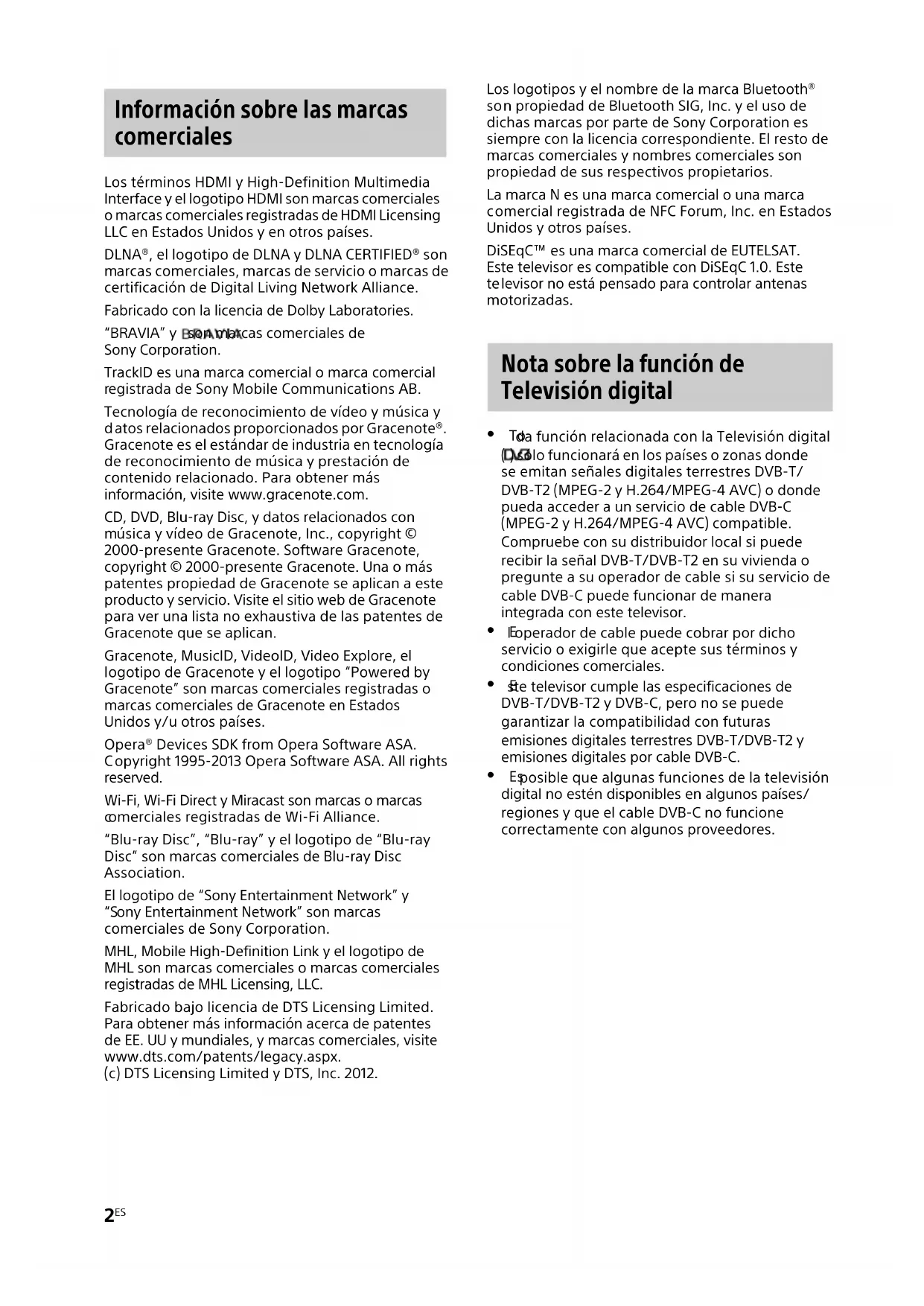 posible que algunas funciones de la televisión digital no estén disponibles en algunos países/ regiones y que el cable DVB-C no funcione correctamente con algunos proveedores. Información sobre las marcas comerciales Nota sobre la función de Televisión digital3
