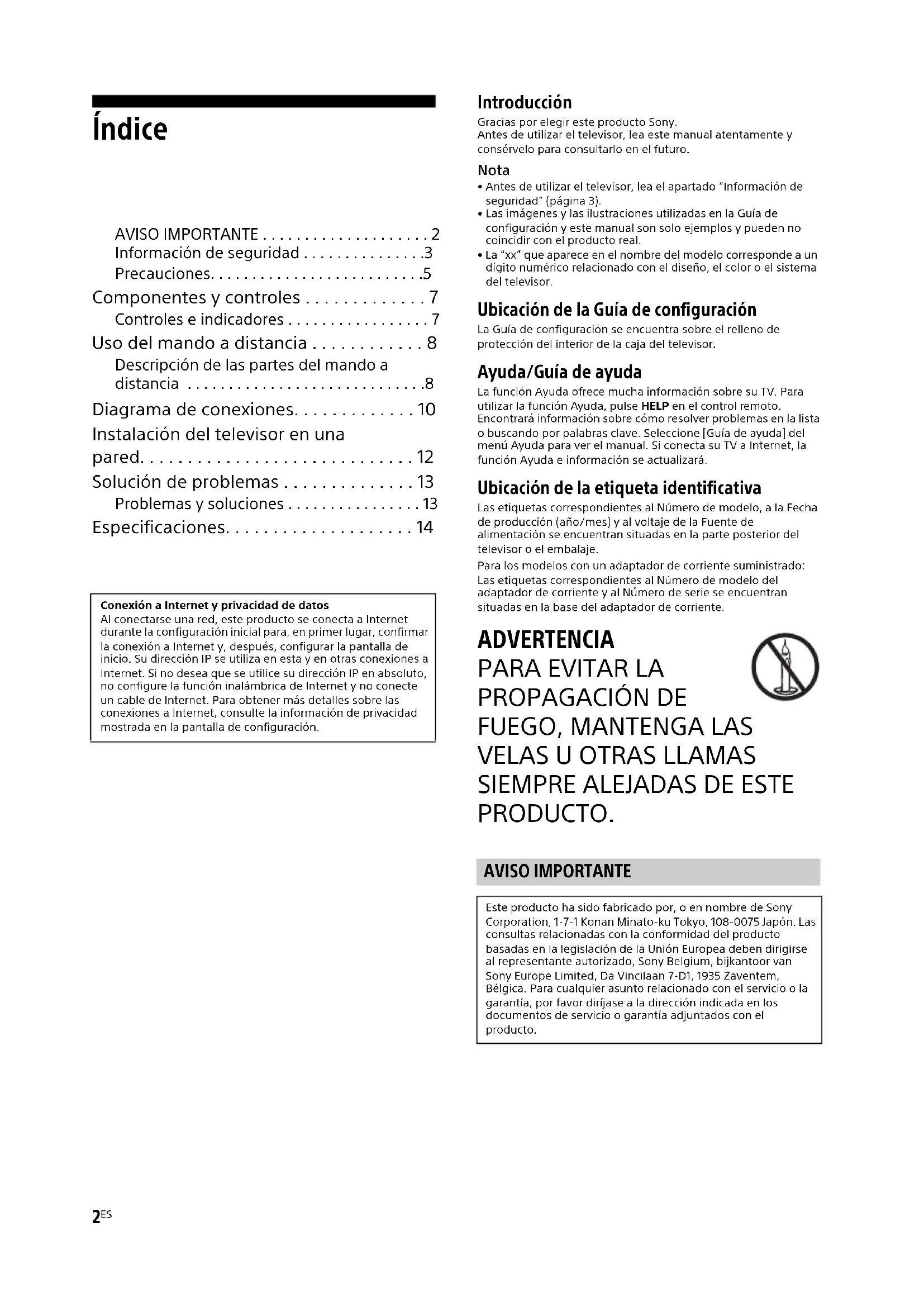 - Especificaciones Introducción Gracias por elegir este producto Sony. Antes de utilizar el televisor, lea este manual atentamente y consérvelo para consultarlo en el futuro. Nota p. 14