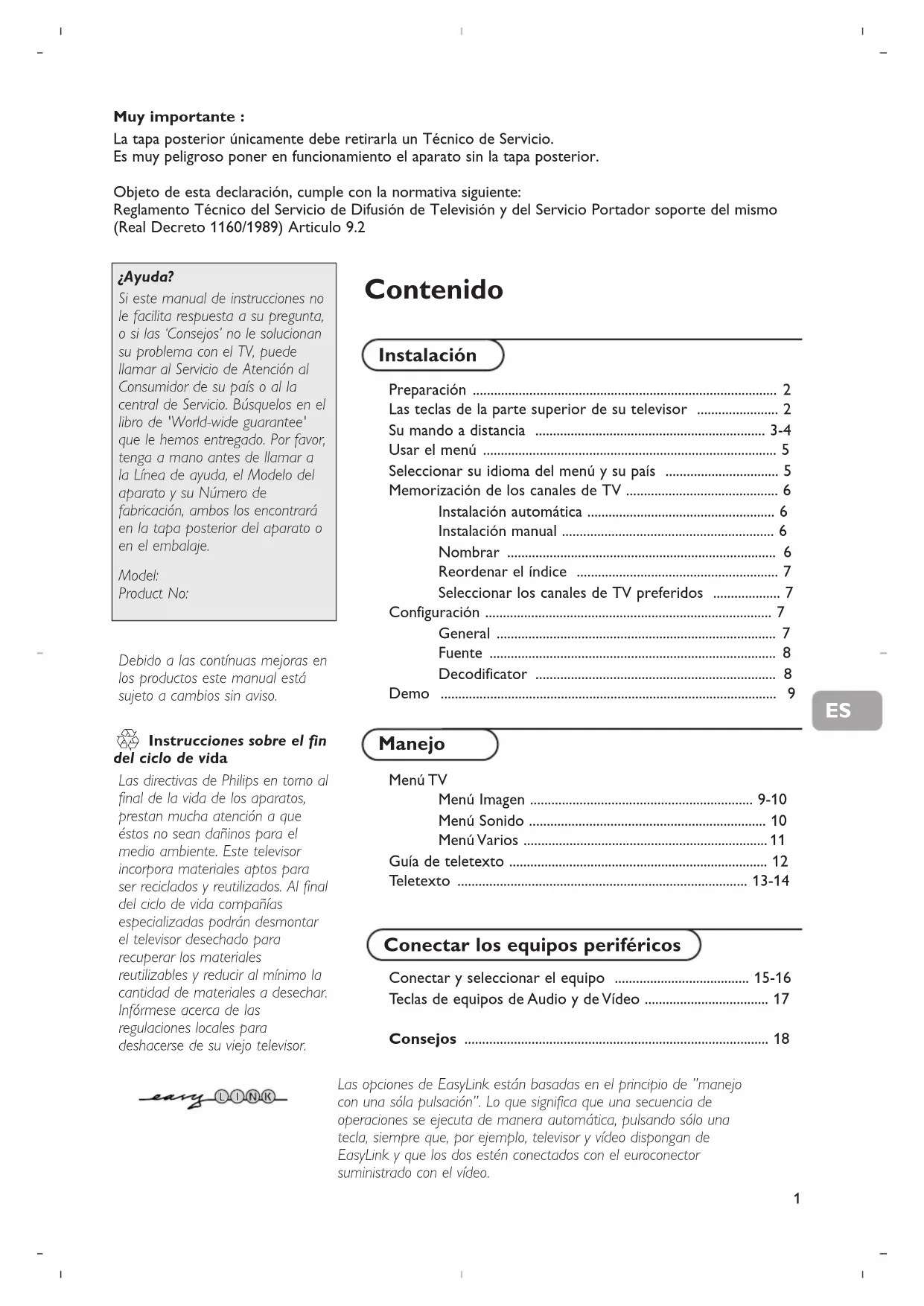 - Для управления телевизором Вы можете использовать кнопку MENU и кнопки -/+, расположенные на верхней панели телевизора. Меню Возможно, Вы неверно выбрали меню? Нажмите ту же кнопку повторно для выхода из меню. Режим ожидания Телевизор потребляет электроэнергию и в режиме ожидания. Расход электроэнергии вносит определенный вклад в загрязнение воздуха и воды. Расход энергии: 1 Вт.1 Conectar y seleccionar el equipo ...................................... 15-16 Teclas de equipos de Audio y de Vídeo ................................... 17 Consejos ...................................................................................... 18 Contenido Preparación ...................................................................................... 2 Las teclas de la parte superior de su televisor ....................... 2 Su mando a distancia ................................................................. 3-4 Usar el menú ................................................................................... 5 Seleccionar su idioma del menú y su país ................................ 5 Memorización de los canales de TV ........................................... 6 Instalación automática ..................................................... 6 Instalación manual ............................................................ 6 Nombrar ............................................................................ 6 Reordenar el índice ......................................................... 7 Seleccionar los canales de TV preferidos ................... 7 Configuración ................................................................................. 7 General ............................................................................... 7 Fuente ................................................................................. 8 Decodificator .................................................................... 8 Demo ............................................................................................... 9 Instalación Menú TV Menú Imagen ............................................................... 9-10 Menú Sonido ................................................................... 10 Menú Varios ..................................................................... 11 Guía de teletexto ......................................................................... 12 Teletexto .................................................................................. 13-14 Conectar los equipos periféricos Manejo Las opciones de EasyLink están basadas en el principio de ”manejo con una sóla pulsación”. Lo que significa que una secuencia de operaciones se ejecuta de manera automática, pulsando sólo una tecla, siempre que, por ejemplo, televisor y vídeo dispongan de EasyLink y que los dos estén conectados con el euroconector suministrado con el vídeo. R Instrucciones sobre el fin del ciclo de vida Las directivas de Philips en torno al final de la vida de los aparatos, prestan mucha atención a que éstos no sean dañinos para el medio ambiente. Este televisor incorpora materiales aptos para ser reciclados y reutilizados. Al final del ciclo de vida compañías especializadas podrán desmontar el televisor desechado para recuperar los materiales reutilizables y reducir al mínimo la cantidad de materiales a desechar. Infórmese acerca de las regulaciones locales para deshacerse de su viejo televisor. ¿Ayuda? Si este manual de instrucciones no le facilita respuesta a su pregunta, o si las ‘Consejos’ no le solucionan su problema con el TV, puede llamar al Servicio de Atención al Consumidor de su país o al la central de Servicio. Búsquelos en el libro de 'World-wide guarantee' que le hemos entregado. Por favor, tenga a mano antes de llamar a la Línea de ayuda, el Modelo del aparato y su Número de fabricación, ambos los encontrará en la tapa posterior del aparato o en el embalaje. Model: Product No: Muy importante : La tapa posterior únicamente debe retirarla un Técnico de Servicio. Es muy peligroso poner en funcionamiento el aparato sin la tapa posterior. Objeto de esta declaración, cumple con la normativa siguiente: Reglamento Técnico del Servicio de Difusión de Televisión y del Servicio Portador soporte del mismo (Real Decreto 1160/1989) Articulo 9.2 Debido a las contínuas mejoras en los productos este manual está sujeto a cambios sin aviso. ES2 & Coloque el TV sobre una superficie sólida. Asegúrese de que quede un espacio mínimo de 5 cm alrededor del TV para ventilación del mismo. No sitúe el TV sobre una alfombra. Para evitar situaciones peligrosas, no coloque objetos encima del aparato. Evite calor y exposición directa a la luz solar, a la lluvia o al agua en general. é Inserte firmemente el enchufe de la antena macho en la toma x que se encuentra en la parte posterior del TV. “ Inserte el enchufe principal a la toma de corriente de la red con un voltaje de 220V - 240V. ‘ Mando a distancia: Coloque las dos pilas (tipo R6-1,5V) que se entregan junto con el aparato. Las pilas incluidas con el mando a distancia de su televisor no contienen los metales pesados de mercurio y cadmio. Infórmese acerca de las regulaciones locales para el desecho de pilas descargadas. ( Encendido del TV : Pulse la tecla A situada en la parte frontal de su TV. Una lamparita azul y la pantalla se iluminan. Cuando la TV esté en el modo de espera (lamparita roja), pulse las teclas -P+ o la tecla B de color rojo del mando a distancia. Preparación