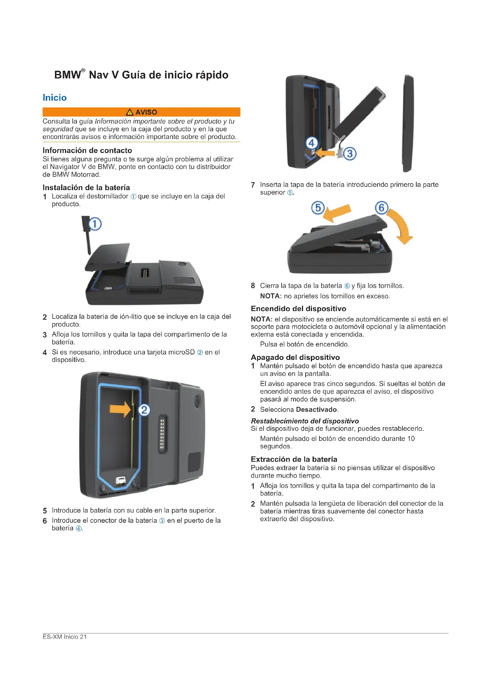 Nav V Guía de inicio rápido Inicio AVISO Consulta la guía Información importante sobre el producto y tu seguridad que se incluye en la caja del producto y en la que encontrarás avisos e información importante sobre el producto. Información de contacto Si tienes alguna pregunta o te surge algún problema al utilizar el Navigator V de BMW, ponte en contacto con tu distribuidor de BMW Motorrad. Instalación de la batería