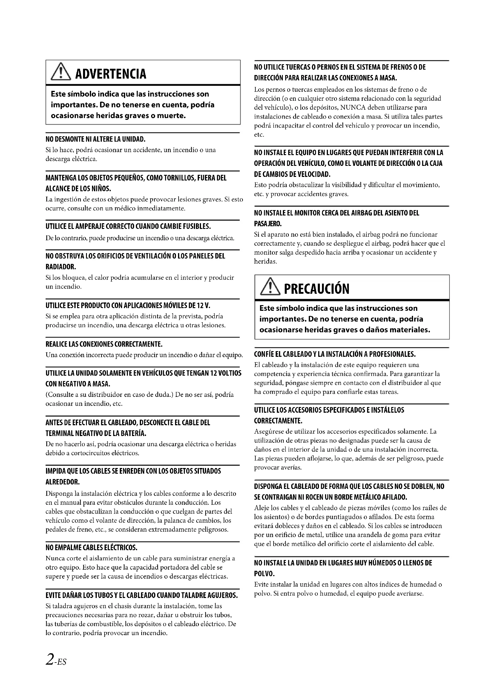 - Ejemplo de sistema 04ES00X801D-U.book Page 1 Tuesday, May 19, 2015 1:42 PM2-ES 04ES04X801D-U_ES.fm ALPINE X801D-U/INE-W997D 68-29530Z17-A (ES) NO DESMONTE NI ALTERE LA UNIDAD. Si lo hace, podrá ocasionar un accidente, un incendio o una descarga eléctrica. MANTENGA LOS OBJETOS PEQUEÑOS, COMO TORNILLOS, FUERA DEL ALCANCE DE LOS NIÑOS. La ingestión de estos objetos puede provocar lesiones graves. Si esto ocurre, consulte con un médico inmediatamente. UTILICE EL AMPERAJE CORRECTO CUANDO CAMBIE FUSIBLES. De lo contrario, puede producirse un incendio o una descarga eléctrica. NO OBSTRUYA LOS ORIFICIOS DE VENTILACIÓN O LOS PANELES DEL RADIADOR. Si los bloquea, el calor podría acumularse en el interior y producir un incendio. UTILICE ESTE PRODUCTO CON APLICACIONES MÓVILES DE 12 V. Si se emplea para otra aplicación distinta de la prevista, podría producirse un incendio, una descarga eléctrica u otras lesiones. REALICE LAS CONEXIONES CORRECTAMENTE. Una conexión incorrecta puede producir un incendio o dañar el equipo. UTILICE LA UNIDAD SOLAMENTE EN VEHÍCULOS QUE TENGAN 12 VOLTIOS CON NEGATIVO A MASA. (Consulte a su distribuidor en caso de duda.) De no ser así, podría ocasionar un incendio, etc. ANTES DE EFECTUAR EL CABLEADO, DESCONECTE EL CABLE DEL TERMINAL NEGATIVO DE LA BATERÍA. De no hacerlo así, podría ocasionar una descarga eléctrica o heridas debido a cortocircuitos eléctricos. IMPIDA QUE LOS CABLES SE ENREDEN CON LOS OBJETOS SITUADOS ALREDEDOR. Disponga la instalación eléctrica y los cables conforme a lo descrito en el manual para evitar obstáculos durante la conducción. Los cables que obstaculizan la conducción o que cuelgan de partes del vehículo como el volante de dirección, la palanca de cambios, los pedales de freno, etc., se consideran extremadamente peligrosos. NO EMPALME CABLES ELÉCTRICOS. Nunca corte el aislamiento de un cable para suministrar energía a otro equipo. Esto hace que la capacidad portadora del cable se supere y puede ser la causa de incendios o descargas eléctricas. EVITE DAÑAR LOS TUBOS Y EL CABLEADO CUANDO TALADRE AGUJEROS. Si taladra agujeros en el chasis durante la instalación, tome las precauciones necesarias para no rozar, dañar u obstruir los tubos, las tuberías de combustible, los depósitos o el cableado eléctrico. De lo contrario, podría provocar un incendio. NO UTILICE TUERCAS O PERNOS EN EL SISTEMA DE FRENOS O DE DIRECCIÓN PARA REALIZAR LAS CONEXIONES A MASA. Los pernos o tuercas empleados en los sistemas de freno o de dirección (o en cualquier otro sistema relacionado con la seguridad del vehículo), o los depósitos, NUNCA deben utilizarse para instalaciones de cableado o conexión a masa. Si utiliza tales partes podrá incapacitar el control del vehículo y provocar un incendio, etc. NO INSTALE EL EQUIPO EN LUGARES QUE PUEDAN INTERFERIR CON LA OPERACIÓN DEL VEHÍCULO, COMO EL VOLANTE DE DIRECCIÓN O LA CAJA DE CAMBIOS DE VELOCIDAD. Esto podría obstaculizar la visibilidad y dificultar el movimiento, etc. y provocar accidentes graves. NO INSTALE EL MONITOR CERCA DEL AIRBAG DEL ASIENTO DEL PASA JERO. Si el aparato no está bien instalado, el airbag podrá no funcionar correctamente y, cuando se despliegue el airbag, podrá hacer que el monitor salga despedido hacia arriba y ocasionar un accidente y heridas. CONFÍE EL CABLEADO Y LA INSTALACIÓN A PROFESIONALES. El cableado y la instalación de este equipo requieren una competencia y experiencia técnica confirmada. Para garantizar la seguridad, póngase siempre en contacto con el distribuidor al que ha comprado el equipo para confiarle estas tareas. UTILICE LOS ACCESORIOS ESPECIFICADOS E INSTÁLELOS CORRECTAMENTE. Asegúrese de utilizar los accesorios especificados solamente. La utilización de otras piezas no designadas puede ser la causa de daños en el interior de la unidad o de una instalación incorrecta. Las piezas pueden aflojarse, lo que, además de ser peligroso, puede provocar averías. DISPONGA EL CABLEADO DE FORMA QUE LOS CABLES NO SE DOBLEN, NO SE CONTRAIGAN NI ROCEN UN BORDE METÁLICO AFILADO. Aleje los cables y el cableado de piezas móviles (como los raíles de los asientos) o de bordes puntiagudos o afilados. De esta forma evitará dobleces y daños en el cableado. Si los cables se introducen por un orificio de metal, utilice una arandela de goma para evitar que el borde metálico del orificio corte el aislamiento del cable. NO INSTALE LA UNIDAD EN LUGARES MUY HÚMEDOS O LLENOS DE POLVO. Evite instalar la unidad en lugares con altos índices de humedad o polvo. Si entra polvo o humedad, el equipo puede averiarse. ADVERTENCIA Este símbolo indica que las instrucciones son importantes. De no tenerse en cuenta, podría ocasionarse heridas graves o muerte. PRECAUCIÓN Este símbolo indica que las instrucciones son importantes. De no tenerse en cuenta, podría ocasionarse heridas graves o daños materiales. 04ES00X801D-U.book Page 2 Tuesday, May 19, 2015 1:42 PM3-ES 04ES04X801D-U_ES.fm ALPINE X801D-U/INE-W997D 68-29530Z17-A (ES) p. 9