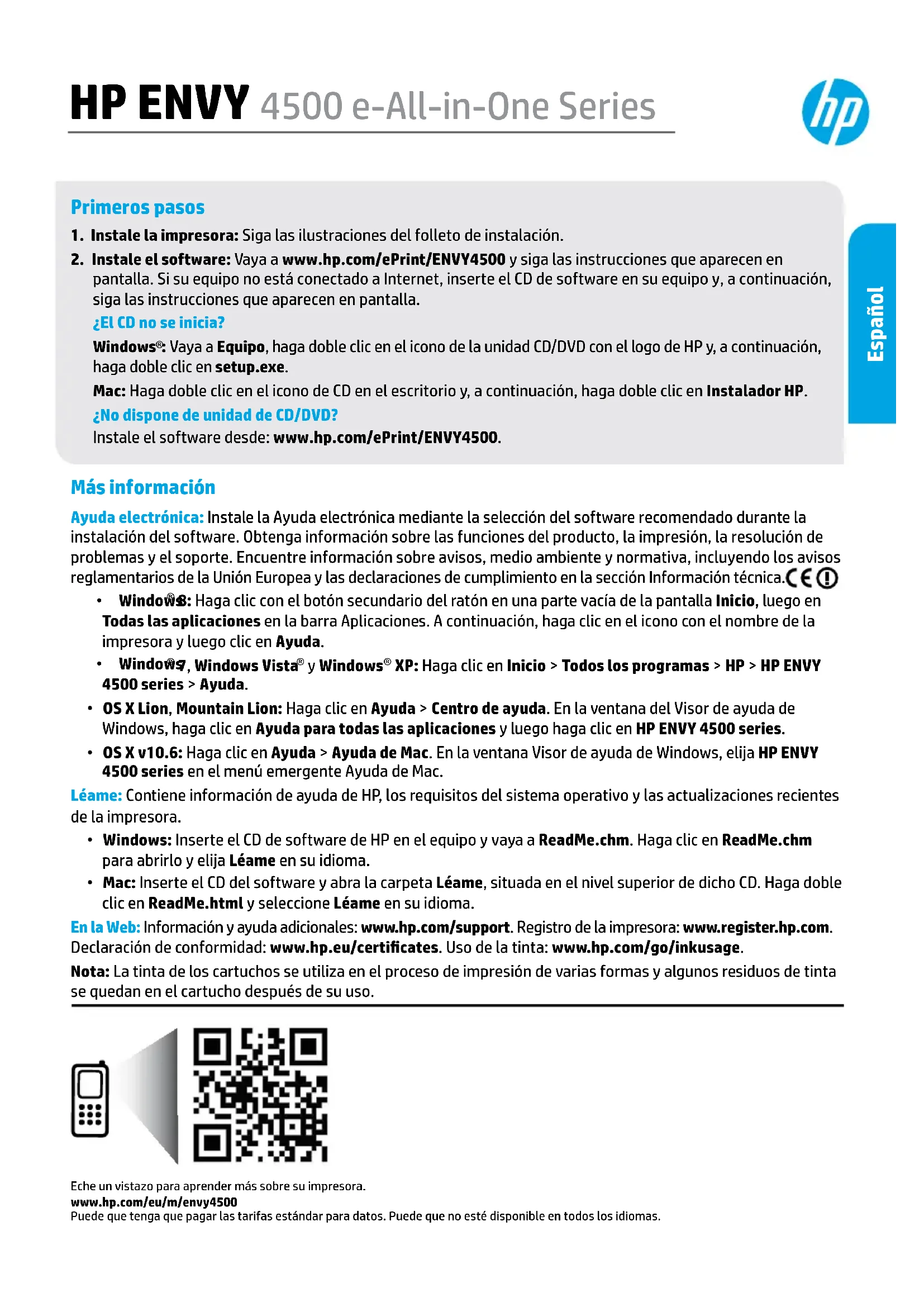 : Vaya a Equipo, haga doble clic en el icono de la unidad CD/DVD con el logo de HP y, a continuación, haga doble clic en setup.exe. Mac: Haga doble clic en el icono de CD en el escritorio y, a continuación, haga doble clic en Instalador HP. ¿No dispone de unidad de CD/DVD? Instale el software desde: www.hp.com/ePrint/ENVY4500. Más información Ayuda electrónica: Instale la Ayuda electrónica mediante la selección del software recomendado durante la instalación del software. Obtenga información sobre las funciones del producto, la impresión, la resolución de problemas y el soporte. Encuentre información sobre avisos, medio ambiente y normativa, incluyendo los avisos reglamentarios de la Unión Europea y las declaraciones de cumplimiento en la sección Información técnica.