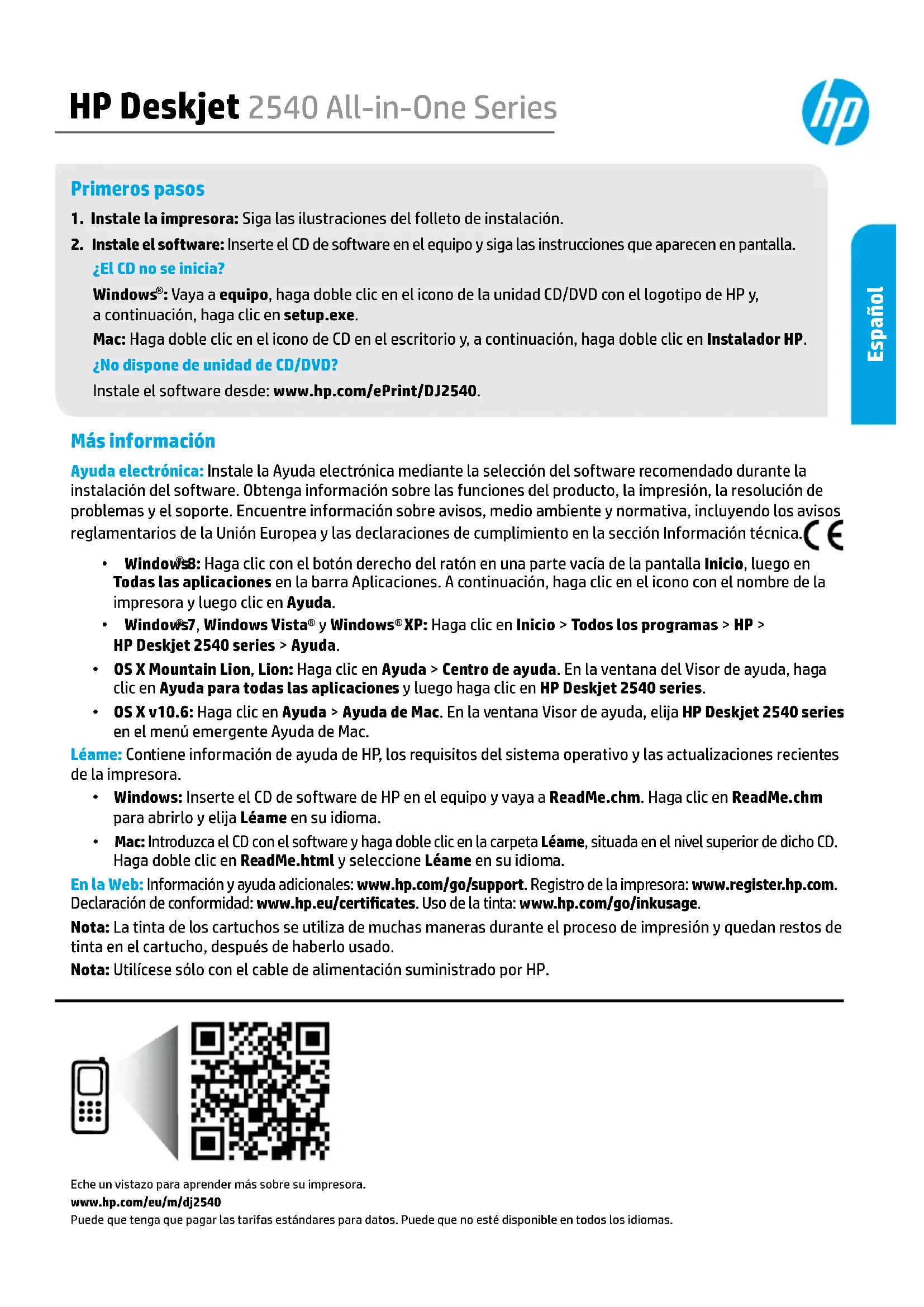 : Vaya a equipo, haga doble clic en el icono de la unidad CD/DVD con el logotipo de HP y, a continuación, haga clic en setup.exe. Mac: Haga doble clic en el icono de CD en el escritorio y, a continuación, haga doble clic en Instalador HP. ¿No dispone de unidad de CD/DVD? Instale el software desde: www.hp.com/ePrint/DJ2540. Más información Ayuda electrónica: Instale la Ayuda electrónica mediante la selección del software recomendado durante la instalación del software. Obtenga información sobre las funciones del producto, la impresión, la resolución de problemas y el soporte. Encuentre información sobre avisos, medio ambiente y normativa, incluyendo los avisos reglamentarios de la Unión Europea y las declaraciones de cumplimiento en la sección Información técnica.