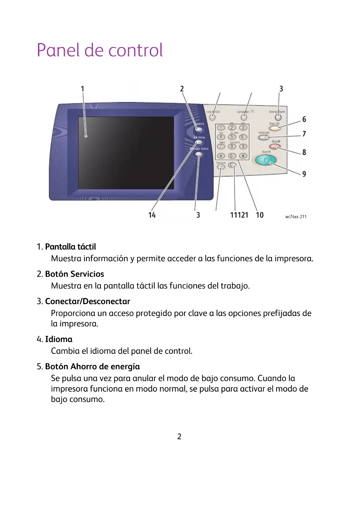 Se pulsa una vez para anular el modo de bajo consumo. Cuando la impresora funciona en modo normal, se pulsa para activar el modo de bajo consumo. ABC GHI PQRS Dial PauseTUV WXYZJKL MNO DEF Stop InterruptClear AllEnergy SaverLog In/OutStartServicesJob SatusMachine Status