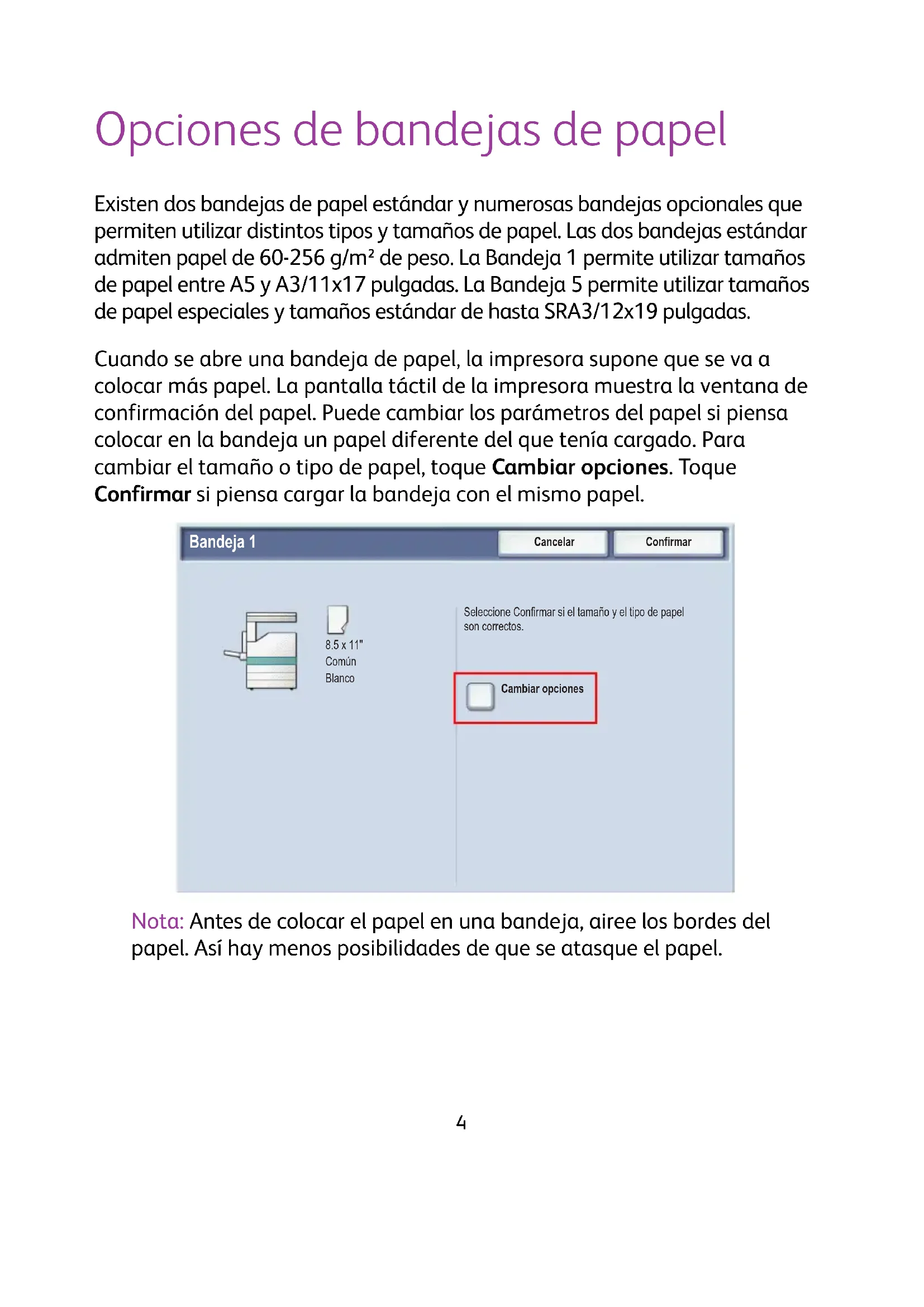 14loading-circle-14 Opciones de bandejas de papel Existen dos bandejas de papel estándar y numerosas bandejas opcionales que permiten utilizar distintos tipos y tamaños de papel. Las dos bandejas estándar admiten papel de 60-256 g/m² de peso. La Bandeja 1 permite utilizar tamaños de papel entre A5 y A3/11x17 pulgadas. La Bandeja 5 permite utilizar tamaños de papel especiales y tamaños estándar de hasta SRA3/12x19 pulgadas. Cuando se abre una bandeja de papel, la impresora supone que se va a colocar más papel. La pantalla táctil de la impresora muestra la ventana de confirmación del papel. Puede cambiar los parámetros del papel si piensa colocar en la bandeja un papel diferente del que tenía cargado. Para cambiar el tamaño o tipo de papel, toque Cambiar opciones. Toque Confirmar si piensa cargar la bandeja con el mismo papel. Nota: Antes de colocar el papel en una bandeja, airee los bordes del papel. Así hay menos posibilidades de que se atasque el papel. Seleccione Confirmar si el tamaño y el tipo de papel son correctos. Bandeja 1
