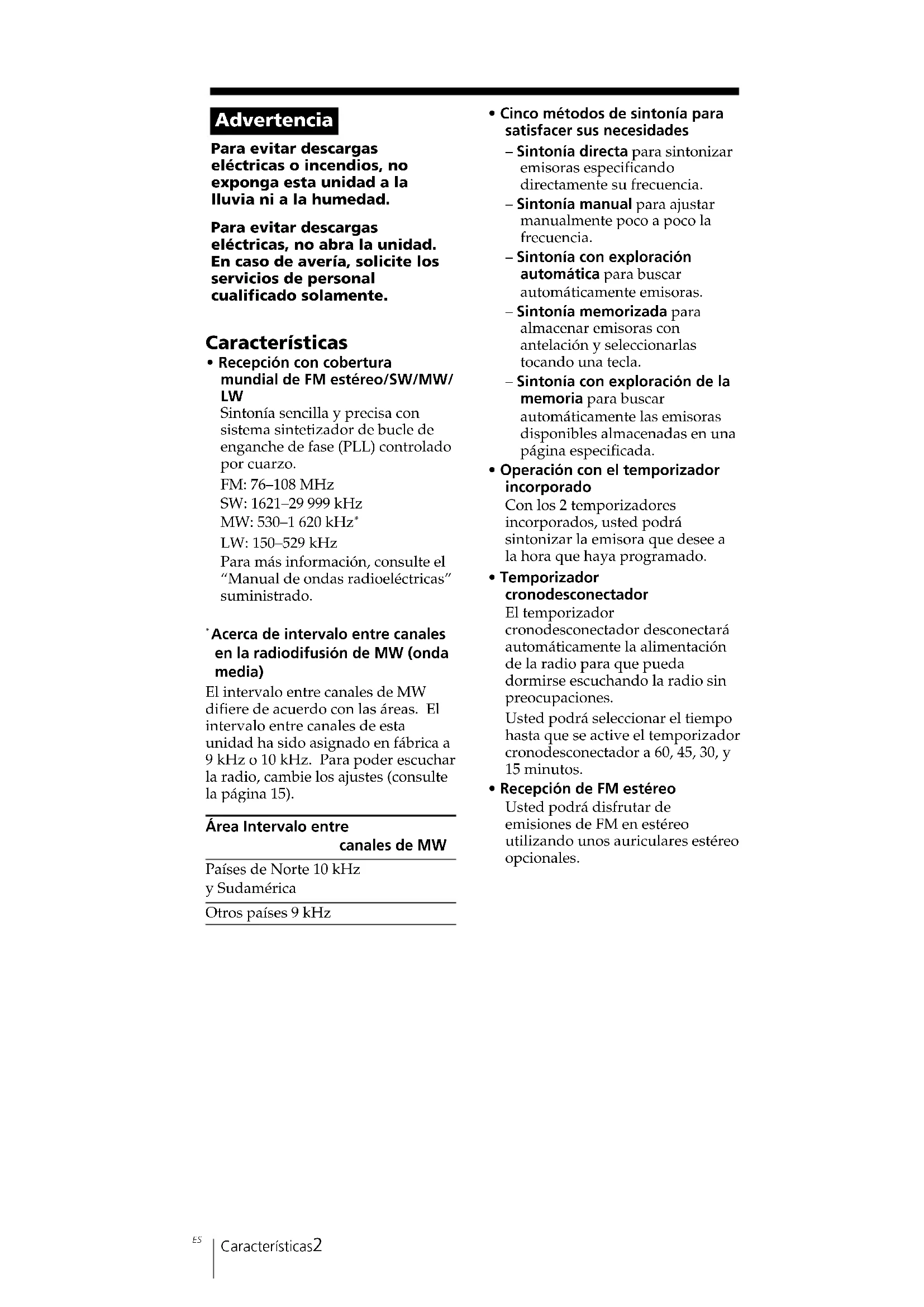 Intervalo entre canales de 10 kHz (consulte la página 15). ** Intervalo entre canales de 9 kHz (consulte la página 15). Nota La gama de frecuencias real de las emisoras de onda corta y la de las bandas métricas para esta unidad puede diferir. Para más información, consulte el “Manual de ondas radioeléctricas” suministrado.