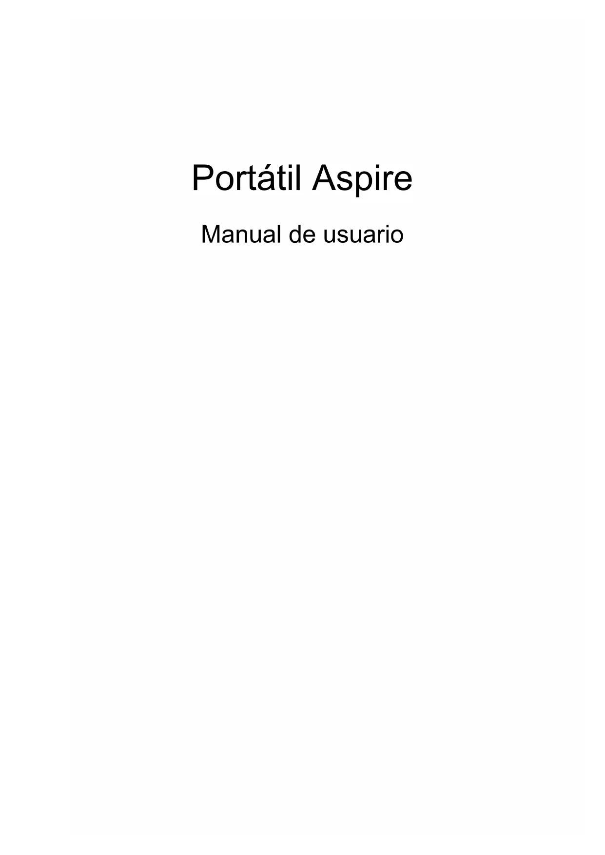 - v'n Pixel fault class Class II Part no.: Ver.: 01.01.06Portátil Aspire Manual de usuarioNúmero de modelo: ____________________ Número de serie: ______________________ Fecha de compra: _____________________ Lugar de compra: _____________________ La información de esta publicación puede estar sujeta a cambios periódicos sin obligación alguna de notificar dichas revisiones o modificaciones. Dichas modificaciones se incorporarán a las nuevas ediciones de la presente guía o documentos y publicaciones complementarios. Esta empresa no hace promesas ni concede garantías, ya sean explícitas o implícitas, sobre el contenido del presente producto y declina expresamente toda garantía implícita de comerciabilidad o idoneidad para un fin determinado. Anote el número de modelo, el número de serie y la fecha y lugar de compra en el espacio provisto a continuación. Los números de serie y modelo figuran en la etiqueta pegada en el ordenador. Toda correspondencia relativa a su unidad deberá incluir los números de serie y modelo, así como la información de compra. Ninguna parte de esta publicación puede ser reproducida, almacenada en sistemas de recuperación o transmitida por ningún medio, ya sea electrónico, mecánico, fotográfico o de otro tipo, sin consentimiento por escrito de Acer Incorporated. © 2012 Reservados todos los derechos. Manual de usuario del portátil Aspire Esta revisión: 01/2013iii Español Información para su seguridad y comodidad Instrucciones de seguridad Lea atentamente estas instrucciones. Guarde este documento para consultarlo en el futuro. Siga los avisos e instrucciones marcados en el producto. Apagado del producto antes de limpiarlo Desconecte el producto de la toma de corriente antes de limpiarlo. No utilice productos de limpieza líquidos ni aerosoles. Utilice unpaño húmedo para la limpieza. PRECAUCIÓN con el enchufe como dispositivo desconectado Preste atención a las siguientes indicaciones cuando conecte o desconecte la energía a la unidad de suministro eléctrico: Instale la unidad de suministro eléctrico antes de conectar el cable de alimentación a la salida de corriente alterna, CA. Desenchufe el cable de alimentación antes de retirar la unidad de suministro eléctrico del ordenador. Si el sistema dispone de múltiples fuentes de alimentación, desconecte la energía del sistema desenchufando todos los cables de alimentación de los suministros de corriente. PRECAUCIÓN en Accesibilidad Asegúrese de que la salida de corriente a la que enchufa el cable de alimentación es fácilmente accesible y que se encuentra lo más próxima posible al operador del equipo. Cuando necesite desconectar la corriente del equipo, asegúrese de desenchufar el cable de alimentación de la salida de corriente. ¡PRECAUCIÓN! Para la(s) tarjeta(s) ficticias suministradas (sólo en ciertos modelos) Su ordenador se entrega con tarjetas ficticias de plástico instaladas en las ranuras para tarjeta. Estas tarjetas protegen las ranuras no utilizadas frente a la entrada de polvo, objetos de metal y otras partículas. Guarde las tarjetas para que se utilicen cuando no haya ninguna en las ranuras.iv Español Advertencias