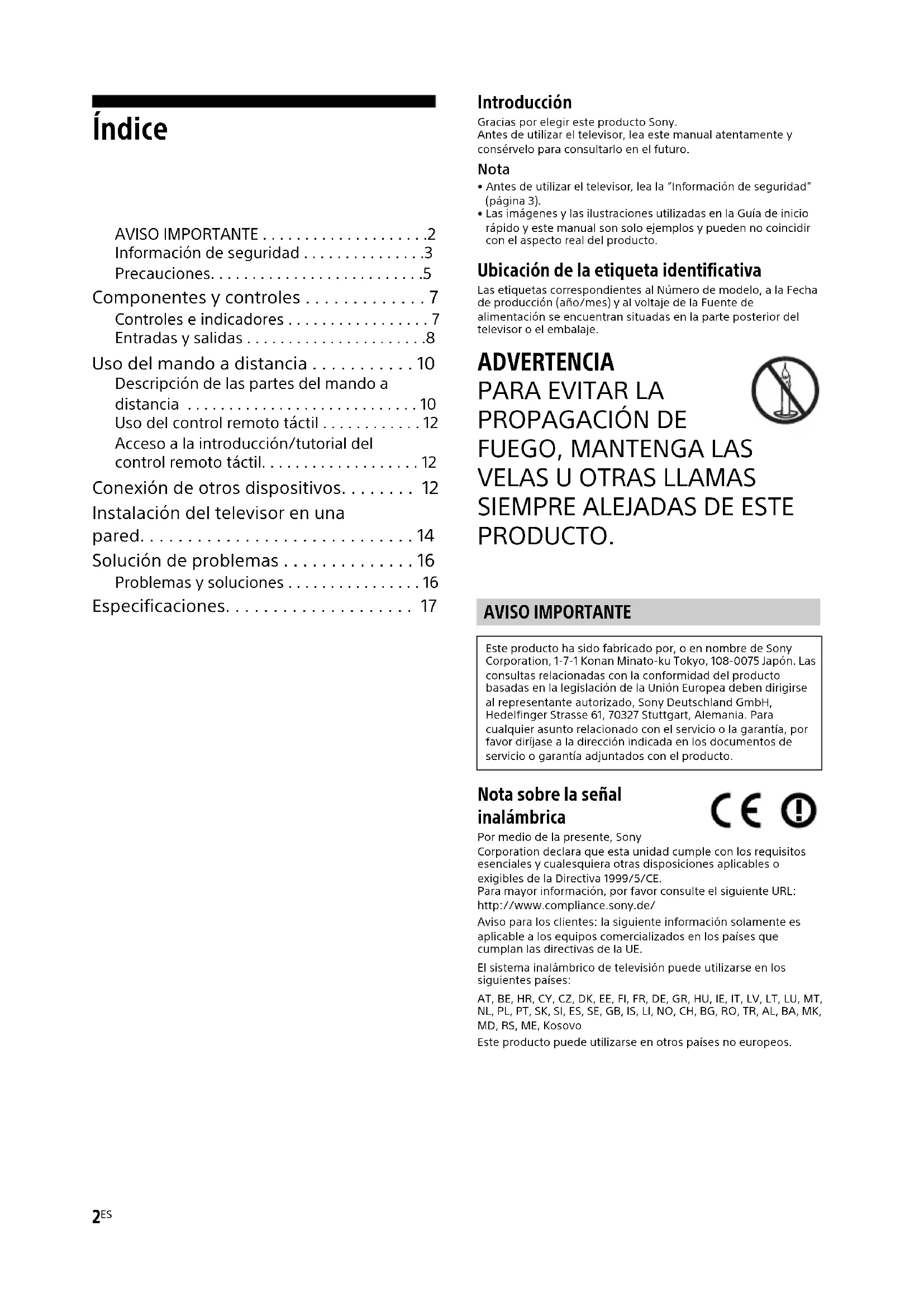 PRODUCTO. Nota sobre la señal inalámbrica Por medio de la presente, Sony Corporation declara que esta unidad cumple con los requisitos esenciales y cualesquiera otras disposiciones aplicables o exigibles de la Directiva 1999/5/CE.Para mayor información, por favor consulte el siguiente URL:http://www.compliance.sony.de/Aviso para los clientes: la siguiente información solamente es aplicable a los equipos comercializados en los países que cumplan las directivas de la UE.El sistema inalámbrico de televisión puede utilizarse en los siguientes países:AT, BE, HR, CY, CZ, DK, EE, FI, FR, DE, GR, HU, IE, IT, LV, LT, LU, MT, NL, PL, PT, SK, SI, ES, SE, GB, IS, LI, NO, CH, BG, RO, TR, AL, BA, MK, MD, RS, ME, KosovoEste producto puede utilizarse en otros países no europeos. AVISO IMPORTANTE Este producto ha sido fabricado por, o en nombre de Sony Corporation, 1-7-1 Konan Minato-ku Tokyo, 108-0075 Japón. Las consultas relacionadas con la conformidad del producto basadas en la legislación de la Unión Europea deben dirigirse al representante autorizado, Sony Deutschland GmbH, Hedelfinger Strasse 61, 70327 Stuttgart, Alemania. Para cualquier asunto relacionado con el servicio o la garantía, por favor diríjase a la dirección indicada en los documentos de servicio o garantía adjuntados con el producto.3