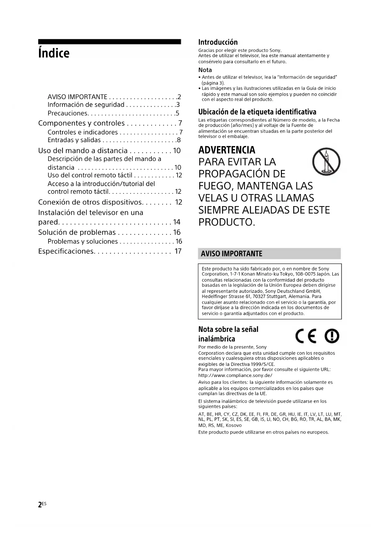 PRODUCTO. Nota sobre la señal inalámbrica Por medio de la presente, Sony Corporation declara que esta unidad cumple con los requisitos esenciales y cualesquiera otras disposiciones aplicables o exigibles de la Directiva 1999/5/CE.Para mayor información, por favor consulte el siguiente URL:http://www.compliance.sony.de/Aviso para los clientes: la siguiente información solamente es aplicable a los equipos comercializados en los países que cumplan las directivas de la UE.El sistema inalámbrico de televisión puede utilizarse en los siguientes países:AT, BE, HR, CY, CZ, DK, EE, FI, FR, DE, GR, HU, IE, IT, LV, LT, LU, MT, NL, PL, PT, SK, SI, ES, SE, GB, IS, LI, NO, CH, BG, RO, TR, AL, BA, MK, MD, RS, ME, KosovoEste producto puede utilizarse en otros países no europeos. AVISO IMPORTANTE Este producto ha sido fabricado por, o en nombre de Sony Corporation, 1-7-1 Konan Minato-ku Tokyo, 108-0075 Japón. Las consultas relacionadas con la conformidad del producto basadas en la legislación de la Unión Europea deben dirigirse al representante autorizado, Sony Deutschland GmbH, Hedelfinger Strasse 61, 70327 Stuttgart, Alemania. Para cualquier asunto relacionado con el servicio o la garantía, por favor diríjase a la dirección indicada en los documentos de servicio o garantía adjuntados con el producto.3