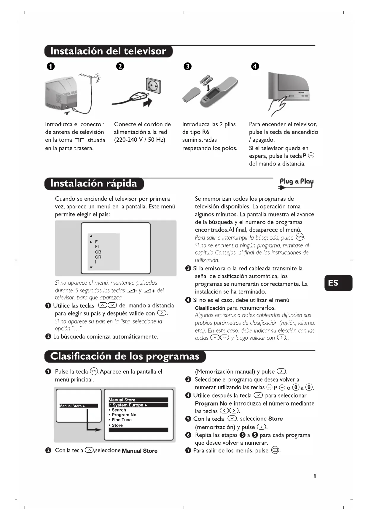 ) ‰Îfl ‚˚·Ó‡ ‡Á΢Ì˚ı ÂÊËÏÓ‚: 4:3 àÁÓ·p‡ÊÂÌË ‚ÓÒÔpÓËÁ‚Ó‰ËÚÒfl ‚ ÙÓpχÚ 4:3. ê‡Ò¯ËpÂÌÌ˚È 4:3 àÁÓ·p‡ÊÂÌË ۂÂ΢ÂÌÓ ÔÓ ‚ÂpÚË͇ÎË. êÂÊËÏ ËÒÔÓθÁÛÂÚÒfl ‰Îfl ÛÒÚp‡ÌÂÌËfl ˜fipÌ˚ı ÔÓÎÓÒ ÔpË ÔpÓÒÏÓÚp ÔpÓ„p‡ÏÏ ‚ ÙÓpχÚ "ÔÓ˜ÚÓ‚˚È fl˘ËÍ". ëʇ¸ 16:9 àÁÓ·p‡ÊÂÌË ÒʇÚÓ ÔÓ ‚ÂpÚË͇ÎË ‰Ó ÙÓpχڇ 16:9.1 Instalación del televisor Introduzca el conector de antena de televisión en la toma : situada en la parte trasera. Conecte el cordón de alimentación a la red (220-240 V / 50 Hz) Introduzca las 2 pilas de tipo R6 suministradas respetando los polos. Para encender el televisor, pulse la tecla de encendido / apagado. Si el televisor queda en espera, pulse la tecla P # del mando a distancia. æÂê® Instalación rápida Clasificación de los programas Cuando se enciende el televisor por primera vez, aparece un menú en la pantalla. Este menú permite elegir el país: Si no aparece el menú, mantenga pulsadas durante 5 segundos las teclas ” - y ”+ del televisor, para que aparezca. & Utilice las teclas îÏ del mando a distancia para elegir su país y después valide con