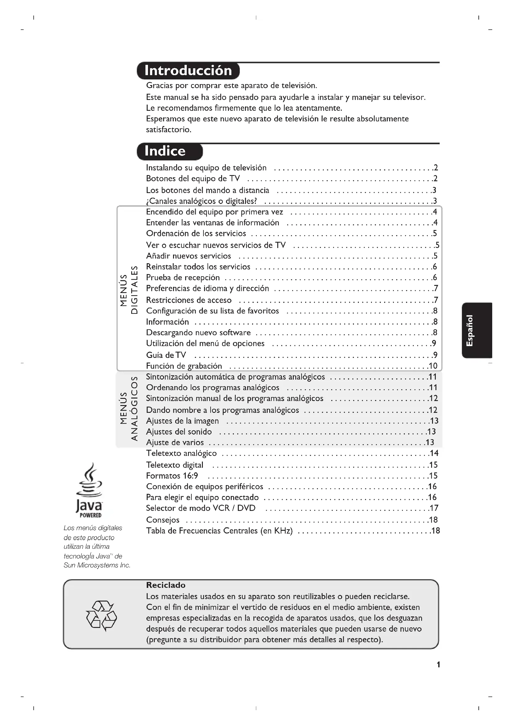 Reciclado Los materiales usados en su aparato son reutilizables o pueden reciclarse. Con el fin de minimizar el vertido de residuos en el medio ambiente, existen empresas especializadas en la recogida de aparatos usados, que los desguazan después de recuperar todos aquellos materiales que pueden usarse de nuevo (pregunte a su distribuidor para obtener más detalles al respecto). Los menús digitales de este producto utilizan la última tecnologÍa Java