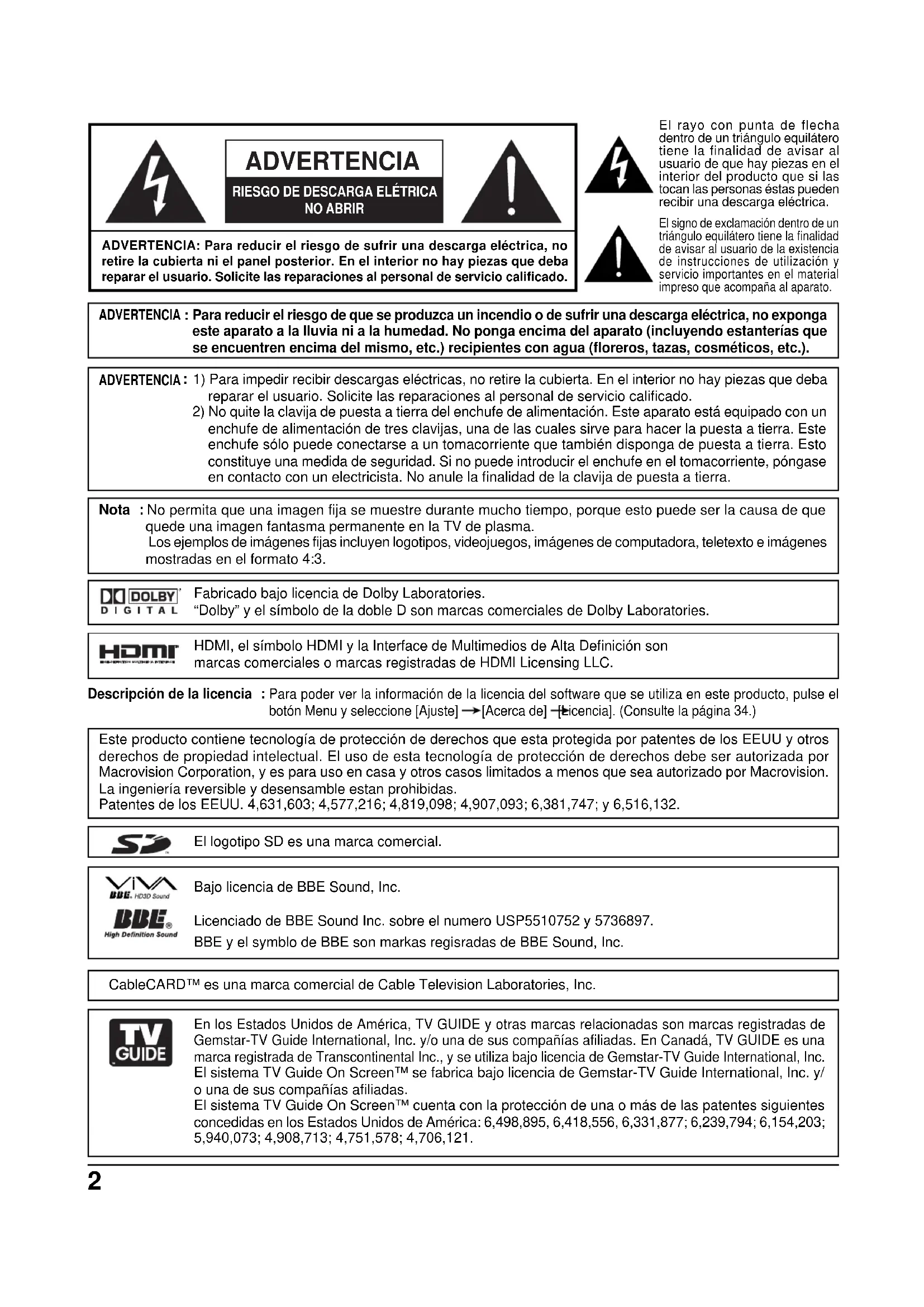 Este producto contiene tecnología de protección de derechos que esta protegida por patentes de los EEUU y otros derechos de propiedad intelectual. El uso de esta tecnología de protección de derechos debe ser autorizada por Macrovision Corporation, y es para uso en casa y otros casos limitados a menos que sea autorizado por Macrovision. La ingeniería reversible y desensamble estan prohibidas. Patentes de los EEUU. 4,631,603; 4,577,216; 4,819,098; 4,907,093; 6,381,747; y 6,516,132. CableCARD™ es una marca comercial de Cable Television Laboratories, Inc. Bajo licencia de BBE Sound, Inc. Licenciado de BBE Sound Inc. sobre el numero USP5510752 y 5736897. BBE y el symblo de BBE son markas regisradas de BBE Sound, Inc. El logotipo SD es una marca comercial. En los Estados Unidos de América, TV GUIDE y otras marcas relacionadas son marcas registradas de Gemstar-TV Guide International, Inc. y/o una de sus compañías afiliadas. En Canadá, TV GUIDE es una marca registrada de Transcontinental Inc., y se utiliza bajo licencia de Gemstar-TV Guide International, Inc. El sistema TV Guide On Screen™ se fabrica bajo licencia de Gemstar-TV Guide International, Inc. y/ o una de sus compañías afiliadas. El sistema TV Guide On Screen™ cuenta con la protección de una o más de las patentes siguientes concedidas en los Estados Unidos de América: 6,498,895, 6,418,556, 6,331,877; 6,239,794; 6,154,203; 5,940,073; 4,908,713; 4,751,578; 4,706,121. ADVERTENCIA: Para reducir el riesgo de sufrir una descarga eléctrica, no retire la cubierta ni el panel posterior. En el interior no hay piezas que deba reparar el usuario. Solicite las reparaciones al personal de servicio calificado. ADVERTENCIA