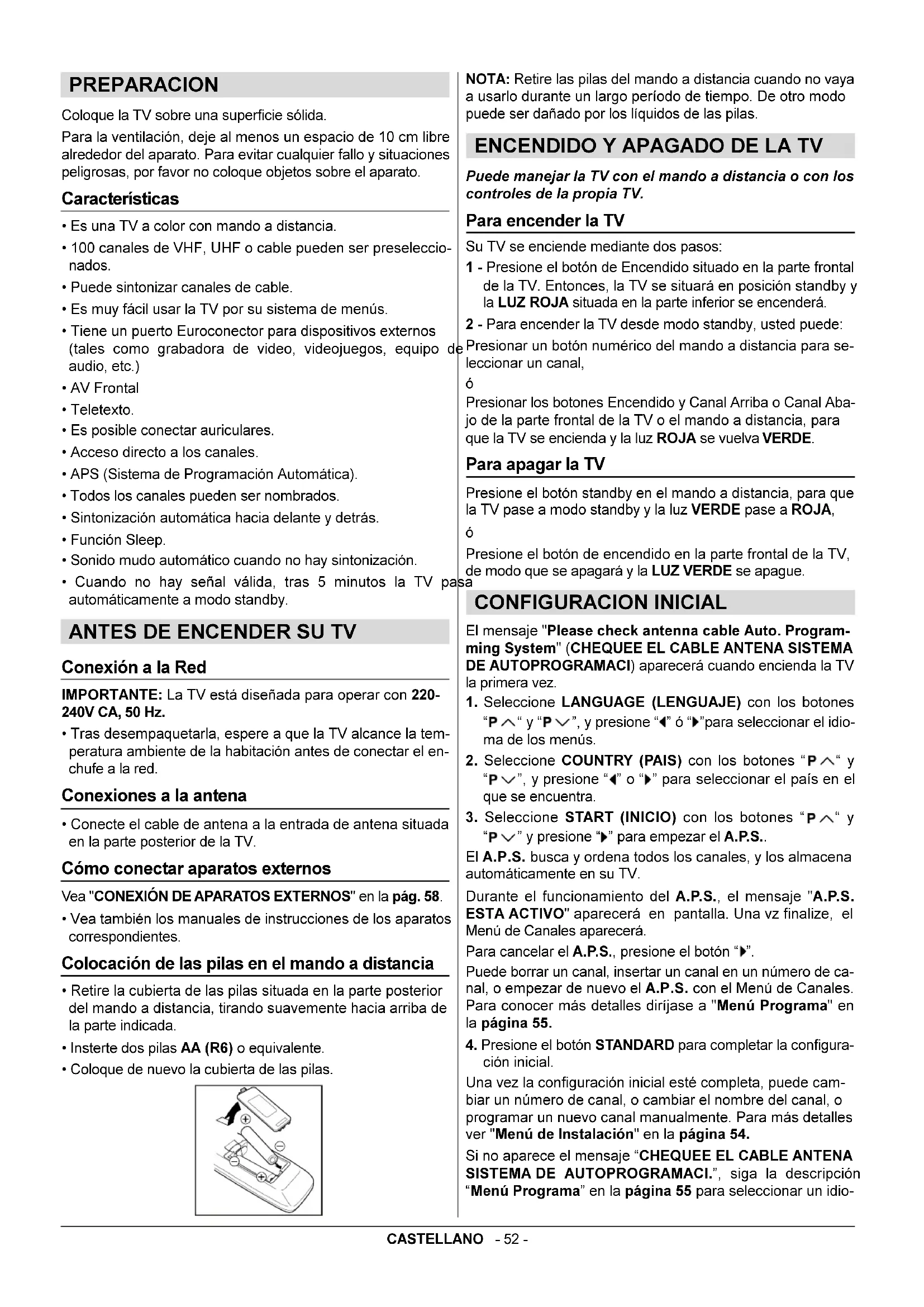 Conexión a la Red IMPORTANTE: La TV está diseñada para operar con 220- 240V CA, 50 Hz. Tras desempaquetarla, espere a que la TV alcance la tem- peratura ambiente de la habitación antes de conectar el en- chufe a la red. Conexiones a la antena Conecte el cable de antena a la entrada de antena situada en la parte posterior de la TV. Cómo conectar aparatos externos Vea "CONEXIÓN DE APARATOS EXTERNOS" en la pág. 58. Vea también los manuales de instrucciones de los aparatos correspondientes. Colocación de las pilas en el mando a distancia Retire la cubierta de las pilas situada en la parte posterior del mando a distancia, tirando suavemente hacia arriba de la parte indicada. Insterte dos pilas AA (R6) o equivalente. Coloque de nuevo la cubierta de las pilas. NOTA: Retire las pilas del mando a distancia cuando no vaya a usarlo durante un largo período de tiempo. De otro modo puede ser dañado por los líquidos de las pilas.