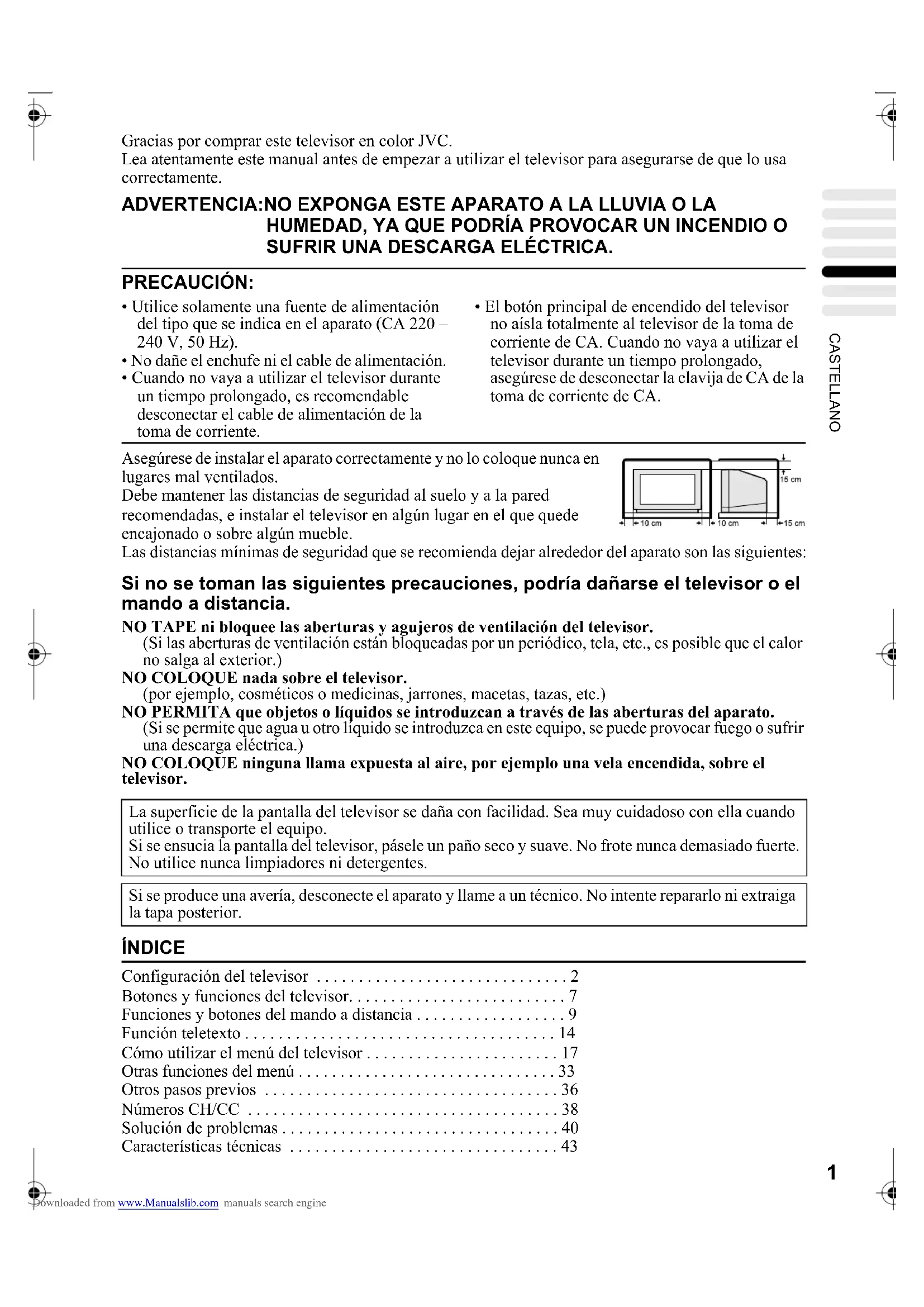 - Video-ingang, S-VIDEO (Y/C)-ingang en audio L/R-ingangen zijn aanwezig. Hoofdtelefoonaansluiting Stereo ministekker (3,5 mm diameter) Afmetingen (B × H × D) 725 mm × 480 mm × 496 mm Gewicht 34,7 kg Accessoires Afstandsbedieningsapparaat × 1 (RM-C54 (grijs) of RM-C50 (zwart) wordt bijgeleverd.) AAA/R03 Penlightbatterij × 2 AV32&28H20EU_Ned.fm Page 45 Wednesday, February 20, 2002 2:07 PM Downloaded from www.Manualslib.com manuals search engine46 AV32/28X25EU / AV32/28H20EU / AV28CH1EU / LCT1142-001A-U / Nederlands AV32&28H20EU_Ned.fm Page 46 Wednesday, February 20, 2002 2:07 PM Downloaded from www.Manualslib.com manuals search engine1 CASTELLANO AV32/28X25EU / AV32/28H20EU / AV28CH1EU / LCT1142-001A-U / Castellano Gracias por comprar este televisor en color JVC. Lea atentamente este manual antes de empezar a utilizar el televisor para asegurarse de que lo usa correctamente. Asegúrese de instalar el aparato correctamente y no lo coloque nunca en lugares mal ventilados. Debe mantener las distancias de seguridad al suelo y a la pared recomendadas, e instalar el televisor en algún lugar en el que quede encajonado o sobre algún mueble. Las distancias mínimas de seguridad que se recomienda dejar alrededor del aparato son las siguientes: Si no se toman las siguientes precauciones, podría dañarse el televisor o el mando a distancia. NO TAPE ni bloquee las aberturas y agujeros de ventilación del televisor. (Si las aberturas de ventilación están bloqueadas por un periódico, tela, etc., es posible que el calor no salga al exterior.) NO COLOQUE nada sobre el televisor. (por ejemplo, cosméticos o medicinas, jarrones, macetas, tazas, etc.) NO PERMITA que objetos o líquidos se introduzcan a través de las aberturas del aparato. (Si se permite que agua u otro líquido se introduzca en este equipo, se puede provocar fuego o sufrir una descarga eléctrica.) NO COLOQUE ninguna llama expuesta al aire, por ejemplo una vela encendida, sobre el televisor. ÍNDICE Configuración del televisor . . . . . . . . . . . . . . . . . . . . . . . . . . . . . . 2 Botones y funciones del televisor. . . . . . . . . . . . . . . . . . . . . . . . . . 7 Funciones y botones del mando a distancia . . . . . . . . . . . . . . . . . . 9 Función teletexto . . . . . . . . . . . . . . . . . . . . . . . . . . . . . . . . . . . . . 14 Cómo utilizar el menú del televisor . . . . . . . . . . . . . . . . . . . . . . . 17 Otras funciones del menú . . . . . . . . . . . . . . . . . . . . . . . . . . . . . . . 33 Otros pasos previos . . . . . . . . . . . . . . . . . . . . . . . . . . . . . . . . . . . 36 Números CH/CC . . . . . . . . . . . . . . . . . . . . . . . . . . . . . . . . . . . . . 38 Solución de problemas . . . . . . . . . . . . . . . . . . . . . . . . . . . . . . . . . 40 Características técnicas . . . . . . . . . . . . . . . . . . . . . . . . . . . . . . . . 43 ADVERTENCIA:NO EXPONGA ESTE APARATO A LA LLUVIA O LA HUMEDAD, YA QUE PODRÍA PROVOCAR UN INCENDIO O SUFRIR UNA DESCARGA ELÉCTRICA. PRECAUCIÓN: