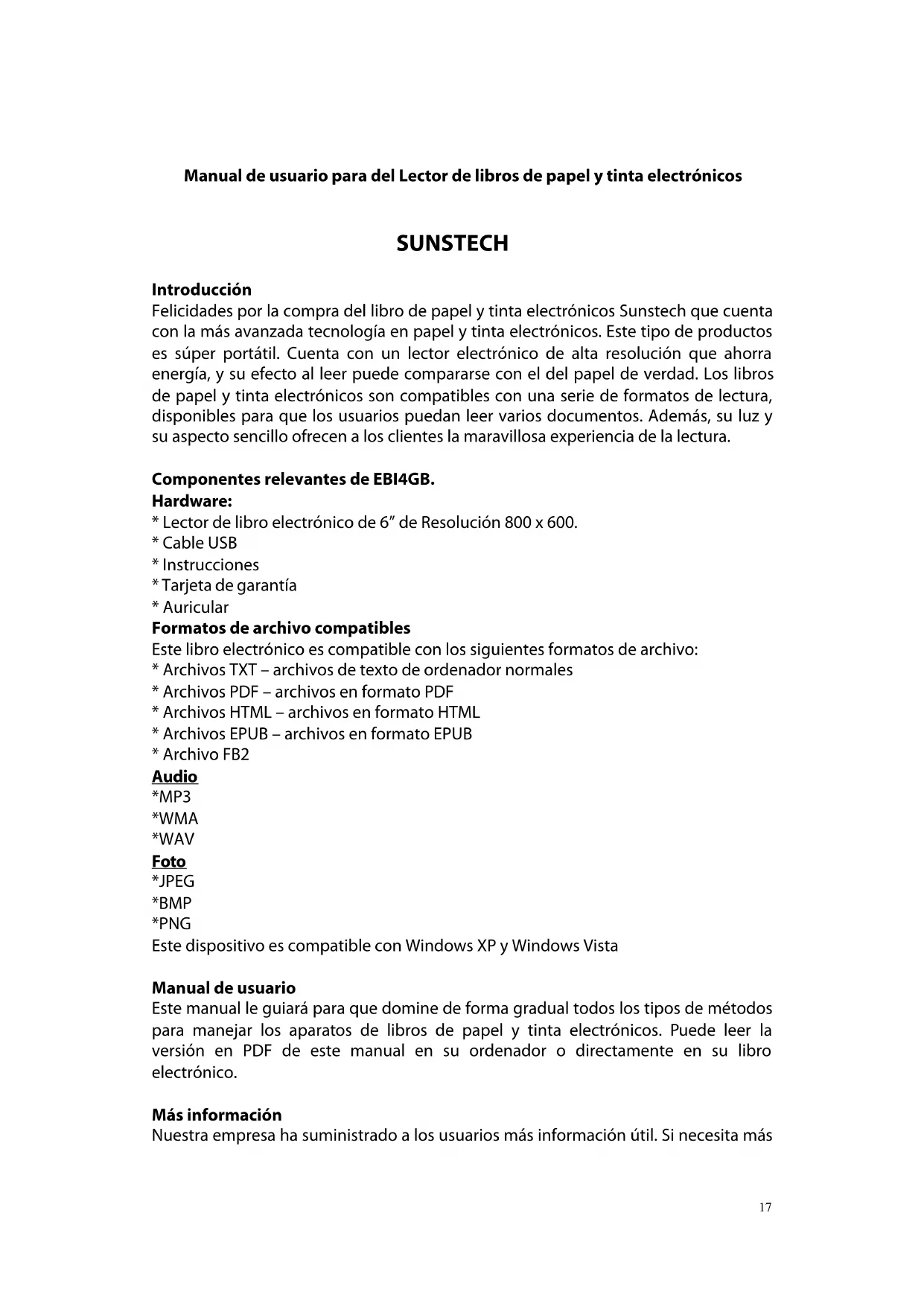 - Archivo FB2 Audio *MP3 *WMA *WAV Foto *JPEG *BMP *PNG Este dispositivo es compatible con Windows XP y Windows Vista Manual de usuario Este manual le guiará para que domine de forma gradual todos los tipos de métodos para manejar los aparatos de libros de papel y tinta electrónicos. Puede leer la versión en PDF de este manual en su ordenador o directamente en su libro electrónico. Más información Nuestra empresa ha suministrado a los usuarios más información útil. Si necesita más 17ayuda regístrese en el sitio web de Sunstech: http://www.Sunstech.es Preparativos antes de la utilización Por favor, lea atentamente las siguientes instrucciones antes de su utilización. Después de comprar este producto cargue las baterías e introduzca la tarjeta Micro SD. Después, puede comenzar a transferir los archivos y a leer algo.