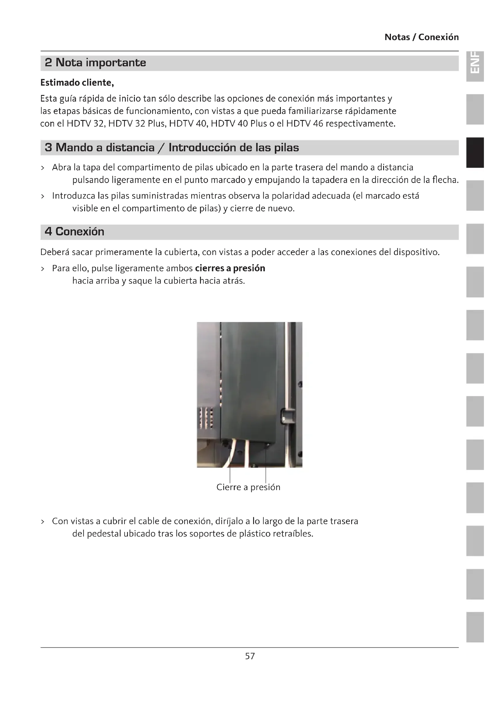 ENFRESITGRNLNODASVFIPLCZHURU Notas / Conexión 2 Nota importante Estimado cliente, Esta guía rápida de inicio tan sólo describe las opciones de conexión más importantes y las etapas básicas de funcionamiento, con vistas a que pueda familiarizarse rápidamente con el HDTV 32, HDTV 32 Plus, HDTV 40, HDTV 40 Plus o el HDTV 46 respectivamente. 3 Mando a distancia / Introducción de las pilas > Abra la tapa del compartimento de pilas ubicado en la parte trasera del mando a distancia pulsando ligeramente en el punto marcado y empujando la tapadera en la dirección de la echa. > Introduzca las pilas suministradas mientras observa la polaridad adecuada (el marcado está visible en el compartimento de pilas) y cierre de nuevo. 4 Conexión Deberá sacar primeramente la cubierta, con vistas a poder acceder a las conexiones del dispositivo. > Para ello, pulse ligeramente ambos cierres a presión hacia arriba y saque la cubierta hacia atrás. > Con vistas a cubrir el cable de conexión, diríjalo a lo largo de la parte trasera del pedestal ubicado tras los soportes de plástico retraíbles. Cierre a presión58 Conexión
