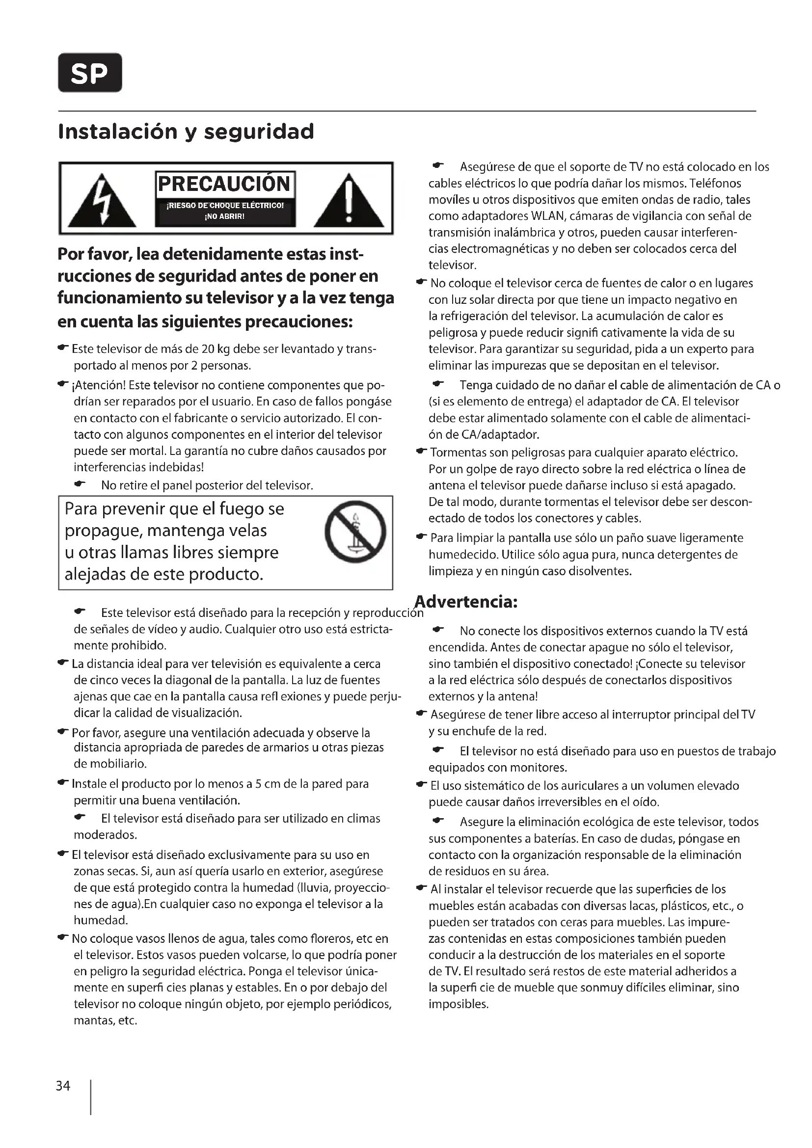 Instalación y seguridad Por favor, lea detenidamente estas inst- rucciones de seguridad antes de poner en funcionamiento su televisor y a la vez tenga en cuenta las siguientes precauciones: Este televisor de más de 20 kg debe ser levantado y trans- portado al menos por 2 personas. ¡Atención! Este televisor no contiene componentes que po- drían ser reparados por el usuario. En caso de fallos pongáse en contacto con el fabricante o servicio autorizado. El con-tacto con algunos componentes en el interior del televisor puede ser mortal. La garantía no cubre daños causados por interferencias indebidas! No retire el panel posterior del televisor. Para prevenir que el fuego se propague, mantenga velas u otras llamas libres siempre alejadas de este producto. Este televisor está diseñado para la recepción y reproducción de señales de vídeo y audio. Cualquier otro uso está estricta-mente prohibido. La distancia ideal para ver televisión es equivalente a cerca de cinco veces la diagonal de la pantalla. La luz de fuentes ajenas que cae en la pantalla causa re exiones y puede perju-dicar la calidad de visualización. Por favor, asegure una ventilación adecuada y observe la distancia apropriada de paredes de armarios u otras piezas de mobiliario. Instale el producto por lo menos a 5 cm de la pared para permitir una buena ventilación. El televisor está diseñado para ser utilizado en climas moderados. El televisor está diseñado exclusivamente para su uso en zonas secas. Si, aun así quería usarlo en exterior, asegúrese de que está protegido contra la humedad (lluvia, proyeccio-nes de agua).En cualquier caso no exponga el televisor a la humedad. No coloque vasos llenos de agua, tales como oreros, etc en el televisor. Estos vasos pueden volcarse, lo que podría poner en peligro la seguridad eléctrica. Ponga el televisor única-mente en super cies planas y estables. En o por debajo del televisor no coloque ningún objeto, por ejemplo periódicos, mantas, etc. Asegúrese de que el soporte de TV no está colocado en los cables eléctricos lo que podría dañar los mismos. Teléfonos movíles u otros dispositivos que emiten ondas de radio, tales como adaptadores WLAN, cámaras de vigilancia con señal de transmisión inalámbrica y otros, pueden causar interferen-cias electromagnéticas y no deben ser colocados cerca del televisor. No coloque el televisor cerca de fuentes de calor o en lugares con luz solar directa por que tiene un impacto negativo en la refrigeración del televisor. La acumulación de calor es peligrosa y puede reducir signi cativamente la vida de su televisor. Para garantizar su seguridad, pida a un experto para eliminar las impurezas que se depositan en el televisor. Tenga cuidado de no dañar el cable de alimentación de CA o (si es elemento de entrega) el adaptador de CA. El televisor debe estar alimentado solamente con el cable de alimentaci-ón de CA/adaptador. Tormentas son peligrosas para cualquier aparato eléctrico. Por un golpe de rayo directo sobre la red eléctrica o línea de antena el televisor puede dañarse incluso si está apagado. De tal modo, durante tormentas el televisor debe ser descon-ectado de todos los conectores y cables. Para limpiar la pantalla use sólo un paño suave ligeramente humedecido. Utilice sólo agua pura, nunca detergentes de limpieza y en ningún caso disolventes. Advertencia: No conecte los dispositivos externos cuando la TV está encendida. Antes de conectar apague no sólo el televisor, sino también el dispositivo conectado! ¡Conecte su televisor a la red eléctrica sólo después de conectarlos dispositivos externos y la antena! Asegúrese de tener libre acceso al interruptor principal del TV y su enchufe de la red. El televisor no está diseñado para uso en puestos de trabajo equipados con monitores. El uso sistemático de los auriculares a un volumen elevado puede causar daños irreversibles en el oído. Asegure la eliminación ecológica de este televisor, todos sus componentes a baterías. En caso de dudas, póngase en contacto con la organización responsable de la eliminación de residuos en su área. Al instalar el televisor recuerde que las super cies de los muebles están acabadas con diversas lacas, plásticos, etc., o pueden ser tratados con ceras para muebles. Las impure-zas contenidas en estas composiciones también pueden conducir a la destrucción de los materiales en el soporte de TV. El resultado será restos de este material adheridos a la super cie de mueble que sonmuy difíciles eliminar, sino imposibles. PRECAUCIÓN ¡RIESGO DE CHOQUE ELÉCTRICO! ¡NO ABRIR!35 Instalación y seguridad La pantalla de su LCD TV cumple con los más altos requisitos de calidad y fue muy cuidadosamente revisada varias veces por píxeles defectuosos. Debido a las características especí- cas tecnológicas del proceso de producción (incluso con el máximo cuidado en la fabricación de pantallas) no es posible a 100% excluir la aparición de un pequeño número de píxeles defectuosos en la pantalla. Estos píxeles defectuosos, bajo condiciones de garantía, no son considerados como error de televisor, si su cobertura no supera los límites establecidos por la norma DIN. Información importante referente al uso de videojuegos, ordenadores, subtítulos u otras visualizaciones de imagen ja La utilización prolongada de material de programa de imagen ja puede provocar una „imagen sombra“ permanen- te en el panel LCD. Esta imagen de fondo es visible en programas normales bajo la forma de una imagen estacionaria ja. Este tipo de deteri- oración irreversible del panel LCD/LED puede ser limitado al efectuar los siguientes pasos: