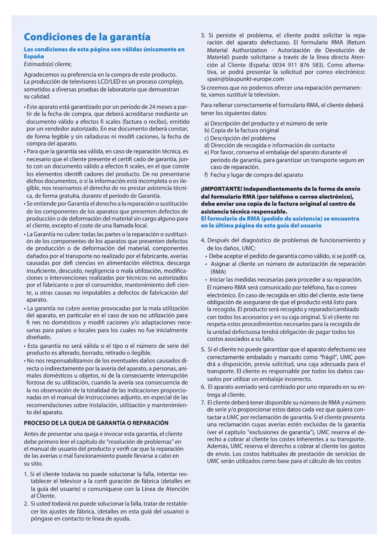 Si persiste el problema, el clienteouldra solicitar la reparacion del aparato defectuoso.El formulario RMA (Return Material Authorization - Autorizacion de Devolucion de Material)uede solicitarse atraves de la linea directa Atencion al Cliente (Espana:0034 911 876 583).Como alternativa, secouldrappresentarla solicitud por correoelectronico: spain@blaupunkt-europe.com