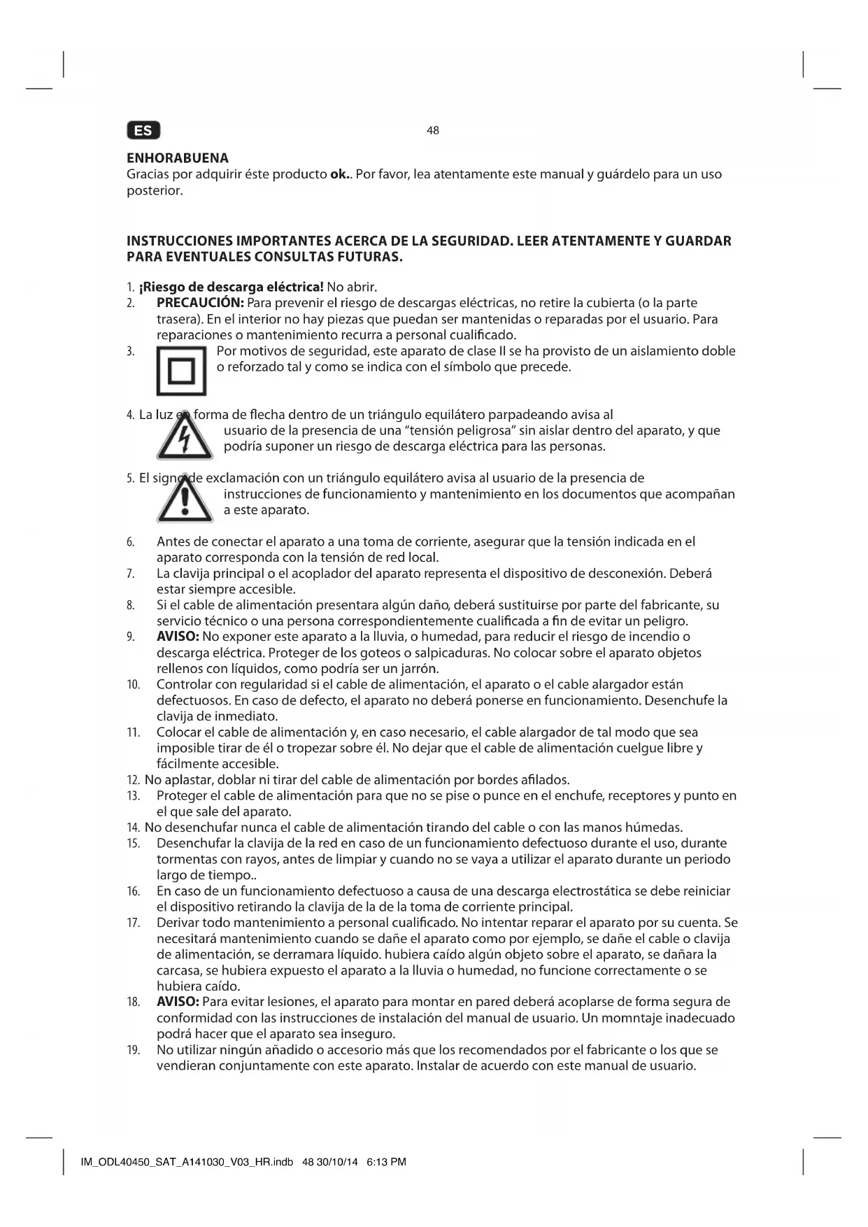 Este aparato ha sido diseñado para recibir y reproducir audio, vídeo y señales de televisión. Debe utilizarse únicamente conforme a las presentes instrucciones. Un uso inadecuado puede ser peligroso y anulará cualquier reclamación de garantía. Tenga en cuenta las instrucciones de seguridad. IM_ODL40450_SAT_A141030_V03_HR.indb 49 30/10/14 6:13 PM50