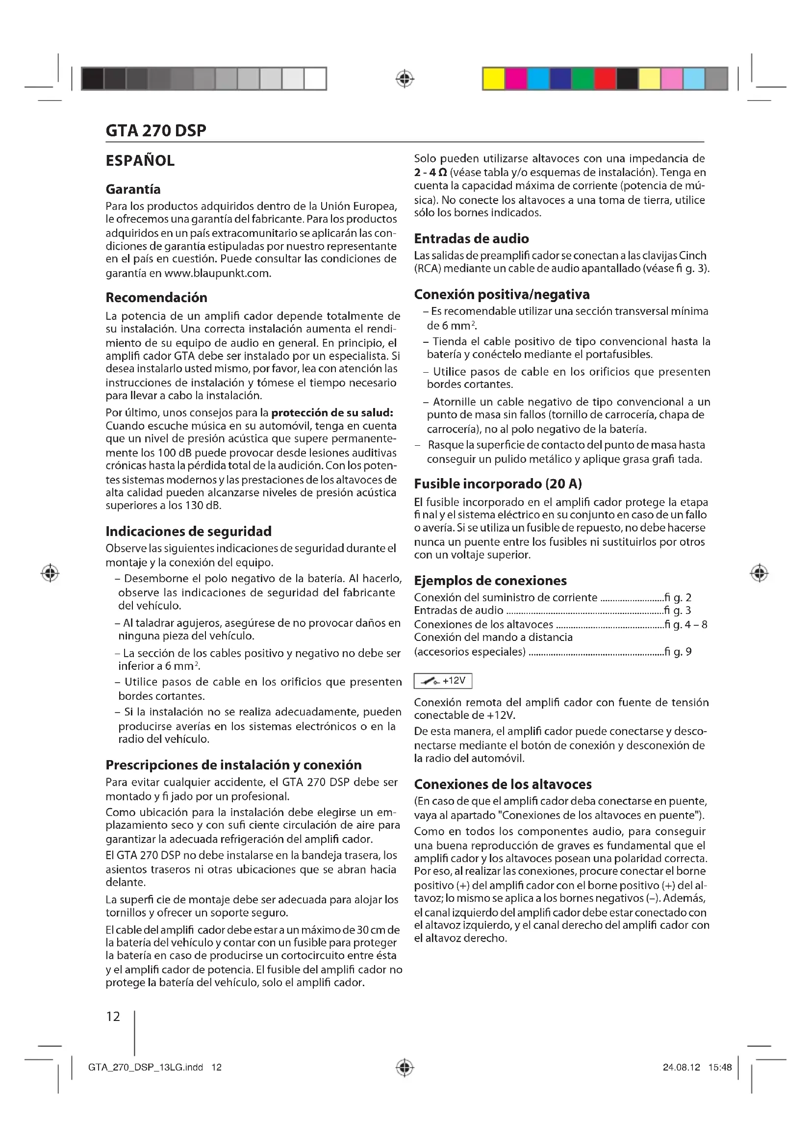 ESPAÑOL Garantía Para los productos adquiridos dentro de la Unión Europea, le ofrecemos una garantía del fabricante. Para los productos adquiridos en un país extracomunitario se aplicarán las con- diciones de garantía estipuladas por nuestro representante en el país en cuestión. Puede consultar las condiciones de garantía en www.blaupunkt.com. Recomendación La potencia de un ampli cador depende totalmente de su instalación. Una correcta instalación aumenta el rendi- miento de su equipo de audio en general. En principio, el ampli cador GTA debe ser instalado por un especialista. Si desea instalarlo usted mismo, por favor, lea con atención las instrucciones de instalación y tómese el tiempo necesario para llevar a cabo la instalación. Por último, unos consejos para la protección de su salud: Cuando escuche música en su automóvil, tenga en cuenta que un nivel de presión acústica que supere permanente- mente los 100 dB puede provocar desde lesiones auditivas crónicas hasta la pérdida total de la audición. Con los poten- tes sistemas modernos y las prestaciones de los altavoces de alta calidad pueden alcanzarse niveles de presión acústica superiores a los 130 dB. Indicaciones de seguridad Observe las siguientes indicaciones de seguridad durante el montaje y la conexión del equipo. – Desemborne el polo negativo de la batería. Al hacerlo, observe las indicaciones de seguridad del fabricante del vehículo. – Al taladrar agujeros, asegúrese de no provocar daños en ninguna pieza del vehículo. – La sección de los cables positivo y negativo no debe ser inferior a 6 mm