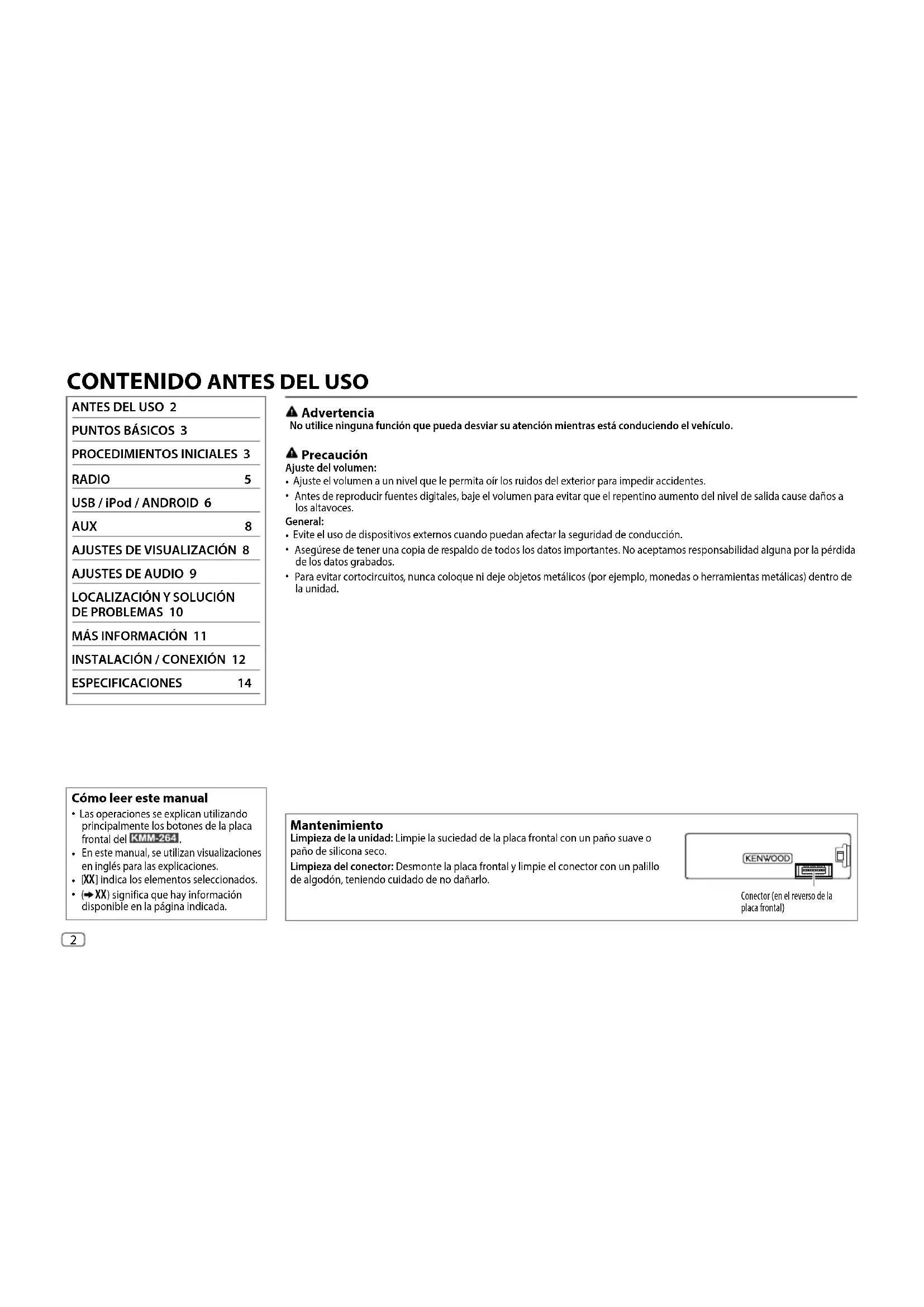 ) significa que hay información disponible en la página indicada. Mantenimiento Limpieza de la unidad: Limpie la suciedad de la placa frontal con un paño suave o paño de silicona seco. Limpieza del conector: Desmonte la placa frontal y limpie el conector con un palillo de algodón, teniendo cuidado de no dañarlo. Conector (en el reverso de la placa frontal) JS_KWD_KMM_264_EN_SP.indd 2JS_KWD_KMM_264_EN_SP.indd 2 9/12/2014 9:04:33 AM9/12/2014 9:04:33 AMData Size: B6L (182 mm x 128 mm) Book Size: B6L (182 mm x 128 mm)