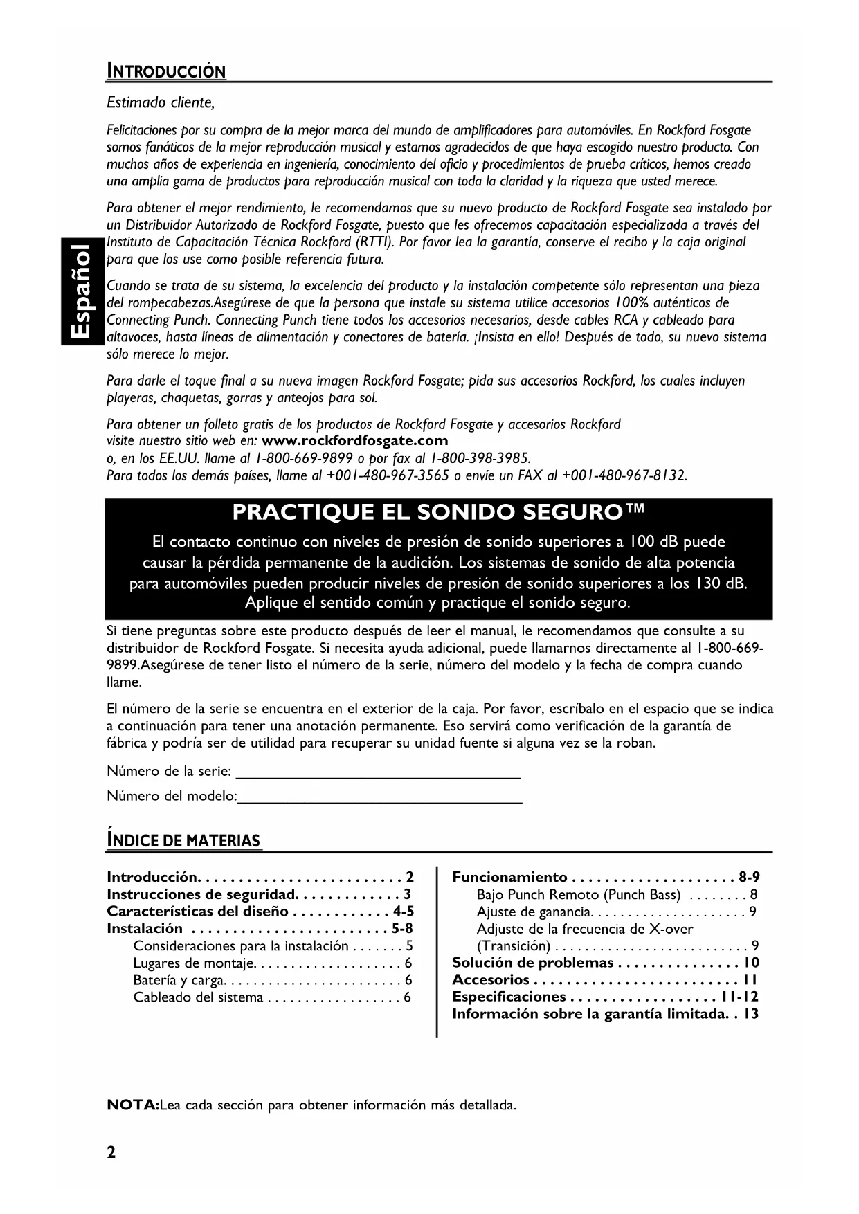¡Bienvenidos a Rockford Fosgate! Este manual ha sido creado para proporcionarle información al dueño, vendedor y técnico de instalación. Para quienes desean información rápida sobre cómo instalar este producto, por favor vean la Sección Instalación de este manual. El resto de la información puede encontrarse usando el Índice de Materias. Nosotros, en Rockford Fosgate hemos trabajado arduamente para asegurarnos que toda la información de este manual esté actualizada. Ya que constantemente encontramos nuevas formas para mejorar nuestros productos, esta información está sujeta a cambios sin previo aviso.
