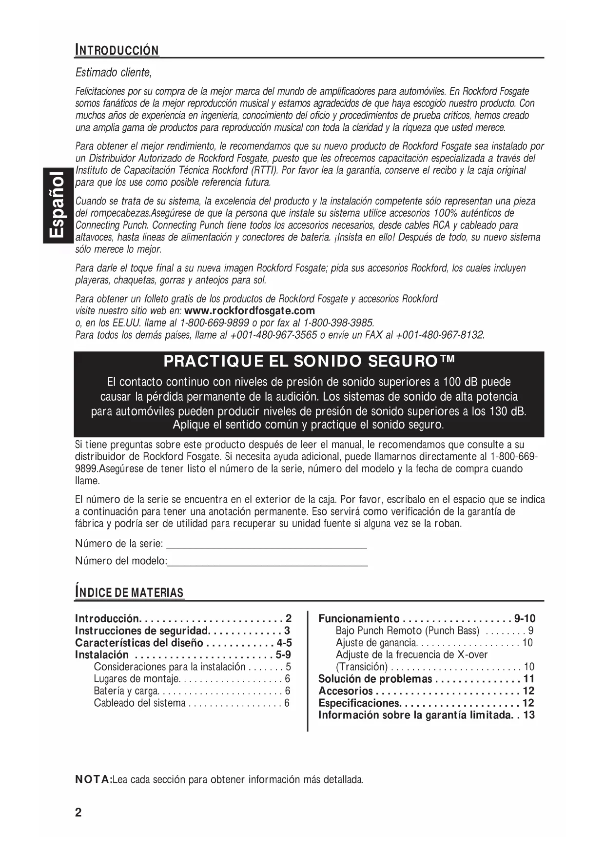 ¡Bienvenidos a Rockford Fosgate! Este manual ha sido creado para proporcionarle información al dueño, vendedor y técnico de instalación. Para quienes desean información rápida sobre cómo instalar este producto, por favor vean la Sección Instalación de este manual. El resto de la información puede encontrarse usando el Índice de Materias. Nosotros, en Rockford Fosgate hemos trabajado arduamente para asegurarnos que toda la información de este manual esté actualizada. Ya que constantemente encontramos nuevas formas para mejorar nuestros productos, esta información está sujeta a cambios sin previo aviso.