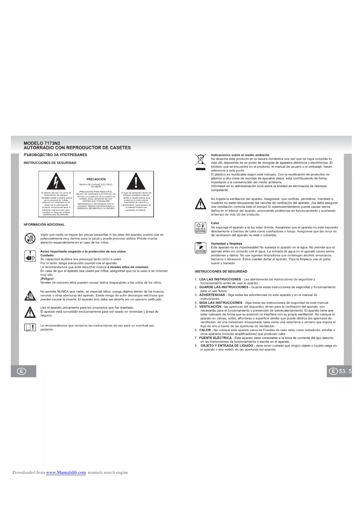 Le recomendamos que conserve las instrucciones de uso para un eventual uso posterior.No permita NUNCA que nadie, en especial niños, ponga objetos dentro de los huecos, ranuras u otras aberturas del aparato. Existe riesgo de sufrir descargas eléctricas que pueden causar la muerte. El aparato solo debe ser abierto por un operario calificado.Vigile que nadie se trague las piezas pequeñas ni las pilas del aparato, puesto que es potencialmente muy dañino para la salud y puede provocar asfixia. Preste mucha atención especialmente en el caso de los niños.Aviso importante respecto a la protección de sus oídosCuidado:Su capacidad auditiva nos preocupa tanto como a usted.Por lo tanto, tenga precaución cuando use el aparato.Le recomendamos que evite escuchar música a niveles altos de volumen.En caso de que el aparato sea usado por niños, asegúrese que no la usen a un volumen muy alto.¡Peligro!Niveles de volumen altos pueden causar daños irreparables a los oídos de los niños.Use el aparato únicamente para los propósitos que fue diseñado.El aparato está concebido exclusivamente para ser usado en viviendas y áreas de negocio.РЪКОВОДСТВО ЗА УПОТРЕБАNESINSTRUCCIONES DE SEGURIDADNFORMACIÓN ADICIONALINSTRUCCIONES DE SEGURIDAD1. LEA LAS INSTRUCCIONES - Lea atentamente las instrucciones de seguridad y funcionamiento antes de usar el aparato.2. GUARDE LAS INSTRUCCIONES - Guarde estas instrucciones de seguridad y funcionamiento para un uso futuro.3. ADVERTENCIAS - Siga todas las advertencias en este aparato y en el manual de instrucciones.4. SIGA LAS INSTRUCCIONES - Siga todas las instrucciones de seguridad de este manual.5. VENTILACIÓN - las aperturas del dispositivo sirven para la ventilación del aparato, son necesarias para el funcionamiento y prevención de sobrecalentamiento. El aparato tiene que estar colocado de forma que su posición no interfiera con su propia ventilación. No coloque el aparato en camas, sofás, alfombras o superficie similar que puede obstruir las aperturas de ventilación, en una instalación incorporada, tales como una estantería o armario que impida el flujo de aire a través de las aperturas de ventilación.6. CALOR - No coloque este aparato cerca de Fuentes de calor tales como radiadores, estufas u otros aparatos (incluido amplificadores) que producen calor.7. FUENTE ELÉCTRICA - Este aparato debe conectarse a la toma de corriente del tipo descrito en las instrucciones de funcionamiento o escrito en el aparato.