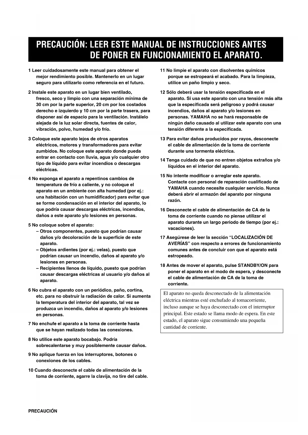 PRECAUCIÓN: LEER ESTE MANUAL DE INSTRUCCIONES ANTES DE PONER EN FUNCIONAMIENTO EL APARATO. 1 Leer cuidadosamente este manual para obtener el mejor rendimiento posible. Mantenerlo en un lugar seguro para utilizarlo como referencia en el futuro. 2 Instale este aparato en un lugar bien ventilado, fresco, seco y limpio con una separación mínima de 30 cm por la parte superior, 20 cm por los costados derecho e izquierdo y 10 cm por la parte trasera, para disponer así de espacio para la ventilación. Instálelo alejada de la luz solar directa, fuentes de calor, vibración, polvo, humedad y/o frío. 3 Coloque este aparato lejos de otros aparatos eléctricos, motores y transformadores para evitar zumbidos. No coloque este aparato donde pueda entrar en contacto con lluvia, agua y/o cualquier otro tipo de líquido para evitar incendios o descargas eléctricas. 4 No exponga el aparato a repentinos cambios de temperatura de frío a caliente, y no coloque el aparato en un ambiente con alta humedad (por ej.: una habitación con un humidificador) para evitar que se forme condensación en el interior del aparato, lo que podría causar descargas eléctricas, incendios, daños a este aparato y/o lesiones en personas. 5 No coloque sobre el aparato: – Otros componentes, puesto que podrían causar daños y/o decoloración de la superficie de este aparato. – Objetos ardientes (por ej.: velas), puesto que podrían causar un incendio, daños al aparato y/o lesiones en personas. – Recipientes llenos de líquido, puesto que podrían causar descargas eléctricas al usuario y/o daños al aparato. 6 No cubra el aparato con un periódico, paño, cortina, etc. para no obstruir la radiación de calor. Si aumenta la temperatura del interior del aparato, tal vez se produzca un incendio, daños al aparato y/o lesiones en personas. 7 No enchufe el aparato a la toma de corriente hasta que se hayan realizado todas las conexiones. 8 No utilice este aparato bocabajo. Podría sobrecalentarse y muy posiblemente causar daños. 9 No aplique fuerza en los interruptores, botones o conexiones de los cables. 10 Cuando desconecte el cable de alimentación de la toma de corriente, agarre la clavija, no tire del cable. 11 No limpie el aparato con disolventes químicos porque se estropeará el acabado. Para la limpieza, utilice un paño limpio y seco. 12 Sólo deberá usar la tensión especificada en el aparato. Si usa este aparato con una tensión más alta que la especificada será peligroso y podrá causar incendios, daños al aparato y/o lesiones en personas. YAMAHA no se hará responsable de ningún daño causado al utilizar este aparato con una tensión diferente a la especificada. 13 Para evitar daños producidos por rayos, desconecte el cable de alimentación de la toma de corriente durante una tormenta eléctrica. 14 Tenga cuidado de que no entren objetos extraños y/o líquidos en el interior del aparato. 15 No intente modificar o arreglar este aparato. Contacte con personal de reparación cualificado de YAMAHA cuando necesite cualquier servicio. Nunca deberá abrir el armazón del aparato por ninguna razón. 16 Desconecte el cable de alimentación de CA de la toma de corriente cuando no piense utilizar el aparato durante un largo periodo de tiempo (por ej.: vacaciones). 17 Asegúrese de leer la sección “LOCALIZACIÓN DE AVERÍAS” con respecto a errores de funcionamiento comunes antes de concluir con que el aparato está estropeado. 18 Antes de mover el aparato, pulse STANDBY/ON para poner el aparato en el modo de espera, y desconecte el cable de alimentación de CA de la toma de corriente. El aparato no queda desconectado de la alimentación eléctrica mientras esté enchufado al tomacorriente, incluso aunque se haya desconectado con el interruptor principal. Este estado se llama modo de espera. En este estado, el aparato sigue consumiendo una pequeña cantidad de corriente. 0601V520RDS_caution_SP 2/1/1, 1:45 PM2Español