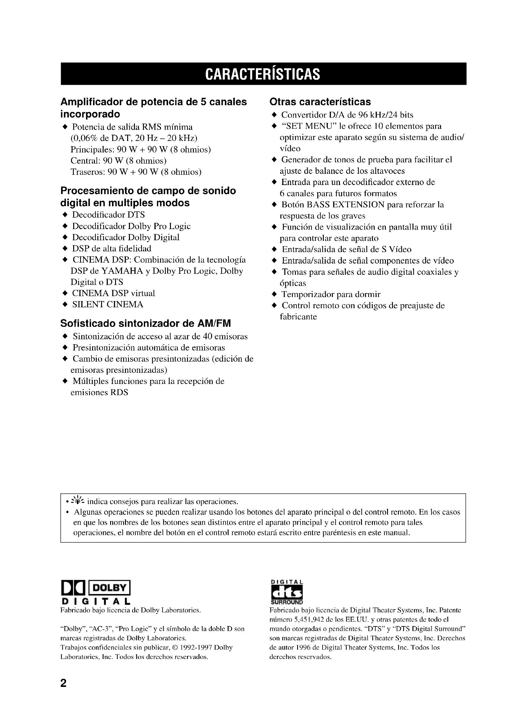 Amplificador de potencia de 5 canales incorporado ◆ Potencia de salida RMS mínima (0,06% de DAT, 20 Hz – 20 kHz) Principales: 90 W + 90 W (8 ohmios) Central: 90 W (8 ohmios) Traseros: 90 W + 90 W (8 ohmios) Procesamiento de campo de sonido digital en multiples modos ◆ Decodificador DTS ◆ Decodificador Dolby Pro Logic ◆ Decodificador Dolby Digital ◆ DSP de alta fidelidad ◆ CINEMA DSP: Combinación de la tecnología DSP de YAMAHA y Dolby Pro Logic, Dolby Digital o DTS ◆ CINEMA DSP virtual ◆ SILENT CINEMA Sofisticado sintonizador de AM/FM ◆ Sintonización de acceso al azar de 40 emisoras ◆ Presintonización automática de emisoras ◆ Cambio de emisoras presintonizadas (edición de emisoras presintonizadas) ◆ Múltiples funciones para la recepción de emisiones RDS Otras características ◆ Convertidor D/A de 96 kHz/24 bits ◆ “SET MENU” le ofrece 10 elementos para optimizar este aparato según su sistema de audio/ vídeo ◆ Generador de tonos de prueba para facilitar el ajuste de balance de los altavoces ◆ Entrada para un decodificador externo de 6 canales para futuros formatos ◆ Botón BASS EXTENSION para reforzar la respuesta de los graves ◆ Función de visualización en pantalla muy útil para controlar este aparato ◆ Entrada/salida de señal de S Vídeo ◆ Entrada/salida de señal componentes de vídeo ◆ Tomas para señales de audio digital coaxiales y ópticas ◆ Temporizador para dormir ◆ Control remoto con códigos de preajuste de fabricante CARACTERÍSTICAS Fabricado bajo licencia de Dolby Laboratories. “Dolby”, “AC-3”, “Pro Logic” y el símbolo de la doble D son marcas registradas de Dolby Laboratories.Trabajos confidenciales sin publicar, © 1992-1997 DolbyLaboratories, Inc. Todos los derechos reservados.Fabricado bajo licencia de Digital Theater Systems, Inc. Patentenúmero 5,451,942 de los EE.UU. y otras patentes de todo el mundo otorgadas o pendientes. “DTS” y “DTS Digital Surround” son marcas registradas de Digital Theater Systems, Inc. Derechosde autor 1996 de Digital Theater Systems, Inc. Todos losderechos reservados.