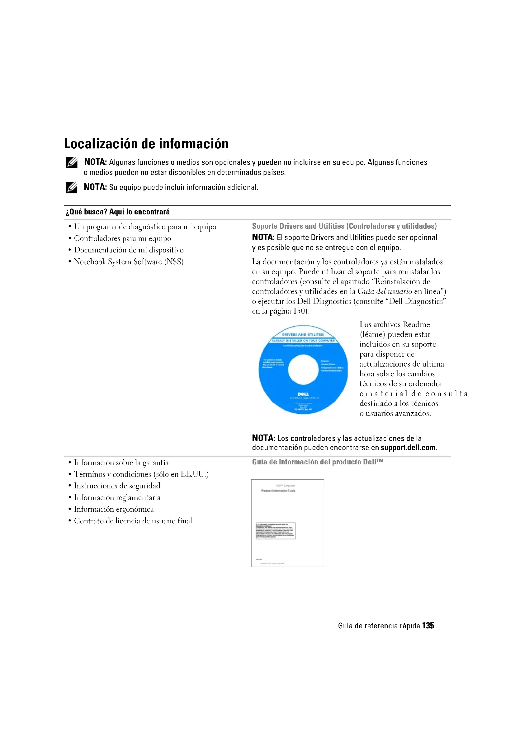 Índice . . . . . . . . . . . . . . . . . . . . . . . . . . . . . . . . . . . . . . . 155134 ContenidoGuía de referencia rápida 135 Localización de información NOTA: Algunas funciones o medios son opcionales y pueden no incluirse en su equipo. Algunas funciones o medios pueden no estar disponibles en determinados países. NOTA: Su equipo puede incluir información adicional. ¿Qué busca? Aquí lo encontrará