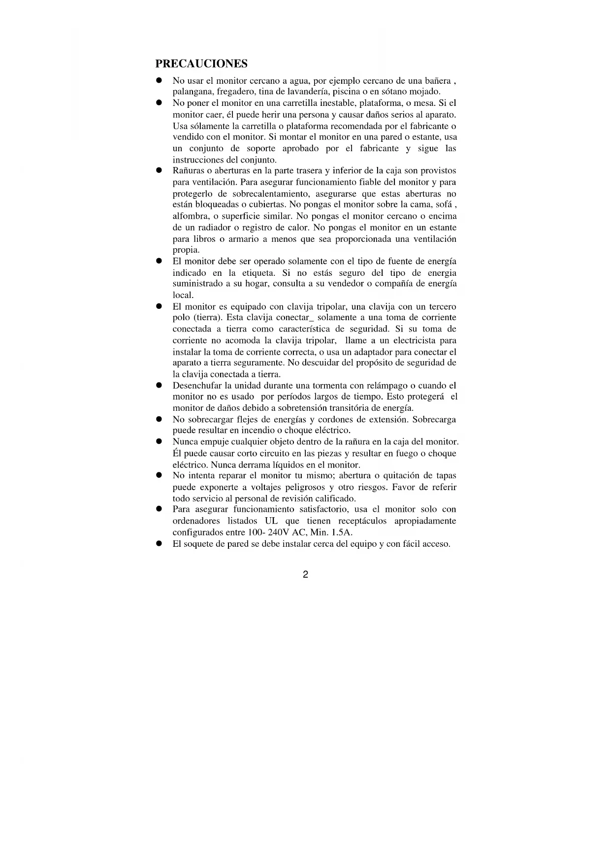 PRECAUCIONES z No usar el monitor cercano a agua, por ejemplo cercano de una bañera , palangana, fregadero, tina de lavandería, piscina o en sótano mojado. z No poner el monitor en una carretilla inestable, plataforma, o mesa. Si el monitor caer, él puede herir una persona y causar daños serios al aparato. Usa sólamente la carretilla o plataforma recomendada por el fabricante o vendido con el monitor. Si montar el monitor en una pared o estante, usa un conjunto de soporte aprobado por el fabricante y sigue las instrucciones del conjunto. z Rañuras o aberturas en la parte trasera y inferior de la caja son provistos para ventilación. Para asegurar funcionamiento fiable del monitor y para protegerlo de sobrecalentamiento, asegurarse que estas aberturas no están bloqueadas o cubiertas. No pongas el monitor sobre la cama, sofá , alfombra, o superficie similar. No pongas el monitor cercano o encima de un radiador o registro de calor. No pongas el monitor en un estante para libros o armario a menos que sea proporcionada una ventilación propia. z El monitor debe ser operado solamente con el tipo de fuente de energía indicado en la etiqueta. Si no estás seguro del tipo de energia suministrado a su hogar, consulta a su vendedor o compañía de energía local. z El monitor es equipado con clavija tripolar, una clavija con un tercero polo (tierra). Esta clavija conectar_ solamente a una toma de corriente conectada a tierra como característica de seguridad. Si su toma de corriente no acomoda la clavija tripolar, llame a un electricista para instalar la toma de corriente correcta, o usa un adaptador para conectar el aparato a tierra seguramente. No descuidar del propósito de seguridad de la clavija conectada a tierra. z Desenchufar la unidad durante una tormenta con relámpago o cuando el monitor no es usado por períodos largos de tiempo. Esto protegerá el monitor de daños debido a sobretensión transitória de energía. z No sobrecargar flejes de energías y cordones de extensión. Sobrecarga puede resultar en incendio o choque eléctrico. z Nunca empuje cualquier objeto dentro de la rañura en la caja del monitor. Él puede causar corto circuito en las piezas y resultar en fuego o choque eléctrico. Nunca derrama líquidos en el monitor. z No intenta reparar el monitor tu mismo; abertura o quitación de tapas puede exponerte a voltajes peligrosos y otro riesgos. Favor de referir todo servicio al personal de revisión calificado. z Para asegurar funcionamiento satisfactorio, usa el monitor solo con ordenadores listados UL que tienen receptáculos apropiadamente configurados entre 100- 240V AC, Min. 1.5A. z El soquete de pared se debe instalar cerca del equipo y con fácil acceso.3