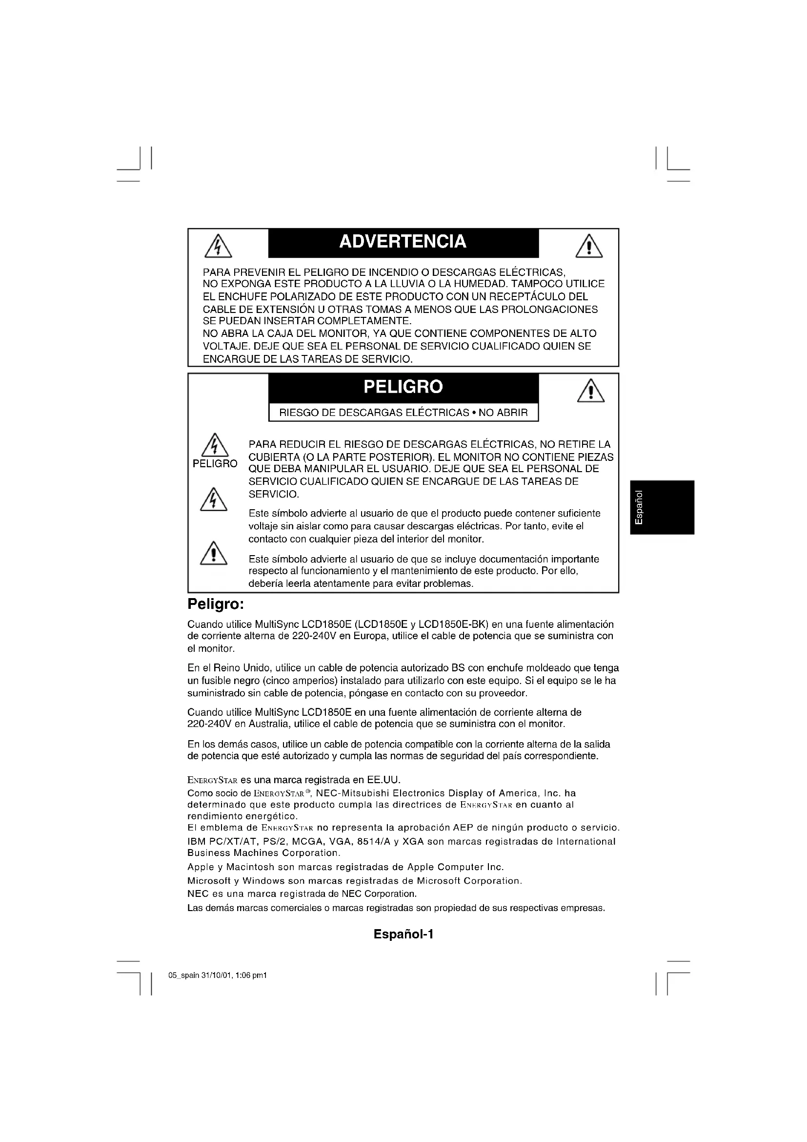 - Μη χρησιµοποιείτε ωσ πρωτεύον χρώµα το µπλε σε σκούρο φντο, επειδή θα είναι δύσκολο να διαβάσετε την οθνη και µπορεί να προκληθεί κπωση στα µάτια λγω ανεπαρκούσ αντίθεσησ φωτειντητασ. 04_greek 31/10/01, 12:39 pm16Español-1 Español PARA PREVENIR EL PELIGRO DE INCENDIO O DESCARGAS ELÉCTRICAS, NO EXPONGA ESTE PRODUCTO A LA LLUVIA O LA HUMEDAD. TAMPOCO UTILICE EL ENCHUFE POLARIZADO DE ESTE PRODUCTO CON UN RECEPTÁCULO DEL CABLE DE EXTENSIÓN U OTRAS TOMAS A MENOS QUE LAS PROLONGACIONES SE PUEDAN INSERTAR COMPLETAMENTE. NO ABRA LA CAJA DEL MONITOR, YA QUE CONTIENE COMPONENTES DE ALTO VOLTAJE. DEJE QUE SEA EL PERSONAL DE SERVICIO CUALIFICADO QUIEN SE ENCARGUE DE LAS TAREAS DE SERVICIO. PELIGRO PARA REDUCIR EL RIESGO DE DESCARGAS ELÉCTRICAS, NO RETIRE LA CUBIERTA (O LA PARTE POSTERIOR). EL MONITOR NO CONTIENE PIEZAS QUE DEBA MANIPULAR EL USUARIO. DEJE QUE SEA EL PERSONAL DE SERVICIO CUALIFICADO QUIEN SE ENCARGUE DE LAS TAREAS DE SERVICIO. Este símbolo advierte al usuario de que el producto puede contener suficiente voltaje sin aislar como para causar descargas eléctricas. Por tanto, evite el contacto con cualquier pieza del interior del monitor. Este símbolo advierte al usuario de que se incluye documentación importante respecto al funcionamiento y el mantenimiento de este producto. Por ello, debería leerla atentamente para evitar problemas. PELIGRO ADVERTENCIA RIESGO DE DESCARGAS ELÉCTRICAS • NO ABRIR Peligro: Cuando utilice MultiSync LCD1850E (LCD1850E y LCD1850E-BK) en una fuente alimentación de corriente alterna de 220-240V en Europa, utilice el cable de potencia que se suministra con el monitor. En el Reino Unido, utilice un cable de potencia autorizado BS con enchufe moldeado que tenga un fusible negro (cinco amperios) instalado para utilizarlo con este equipo. Si el equipo se le ha suministrado sin cable de potencia, póngase en contacto con su proveedor. Cuando utilice MultiSync LCD1850E en una fuente alimentación de corriente alterna de 220-240V en Australia, utilice el cable de potencia que se suministra con el monitor. En los demás casos, utilice un cable de potencia compatible con la corriente alterna de la salida de potencia que esté autorizado y cumpla las normas de seguridad del país correspondiente. ENERGYSTAR es una marca registrada en EE.UU. Como socio de ENERGYSTAR