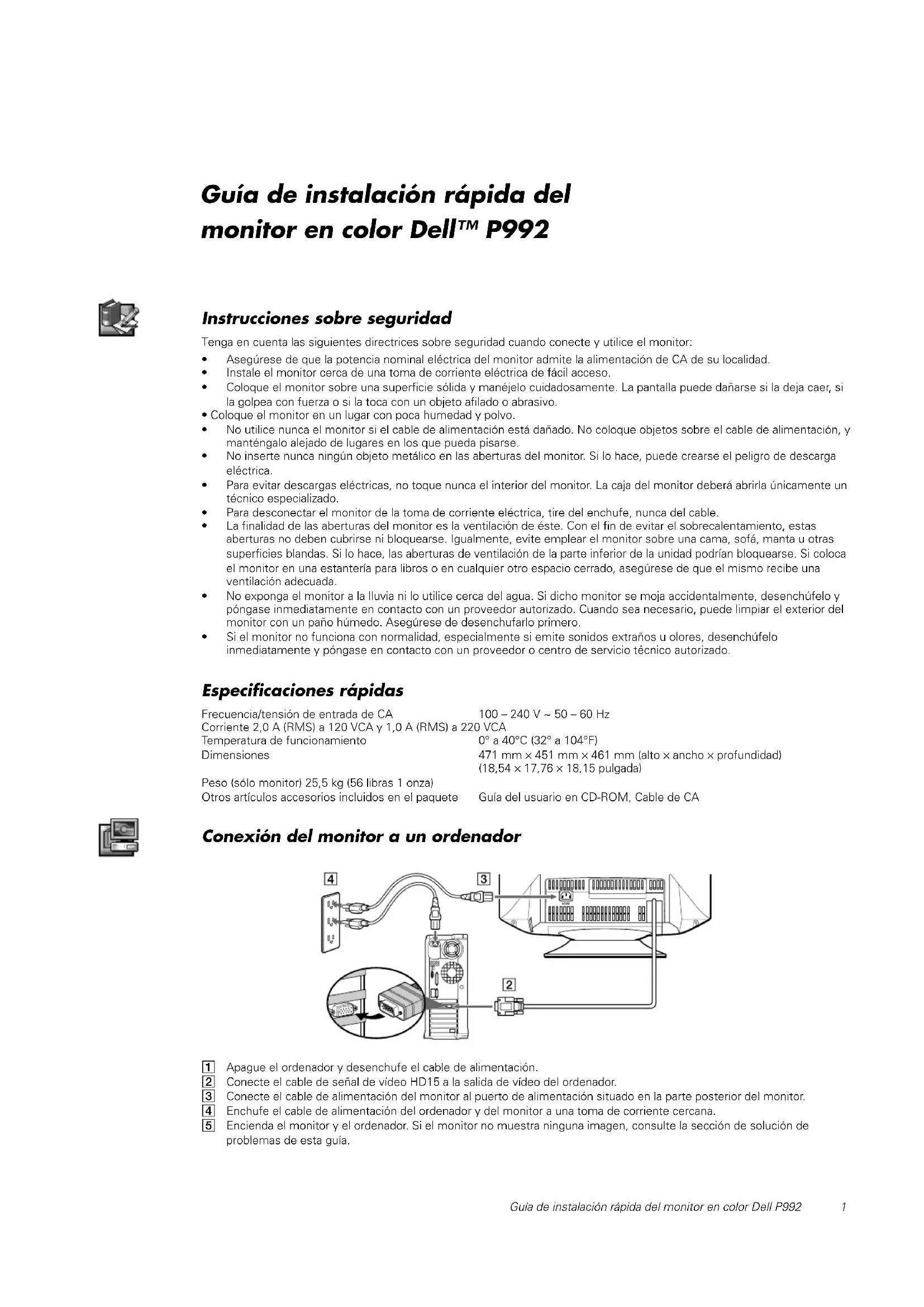 - Si el monitor no funciona con normalidad, especialmente si emite sonidos extraños u olores, desenchúfelo inmediatamente y póngase en contacto con un proveedor o centro de servicio técnico autorizado. Especificaciones rápidas Frecuencia/tensión de entrada de CA 100 – 240 V ~ 50 – 60 Hz Corriente 2,0 A (RMS) a 120 VCA y 1,0 A (RMS) a 220 VCA Temperatura de funcionamiento 0° a 40°C (32° a 104°F) Dimensiones 471 mm × 451 mm × 461 mm (alto × ancho × profundidad) (18,54 × 17,76 × 18,15 pulgada) Peso (sólo monitor) 25,5 kg (56 libras 1 onza) Otros artículos accesorios incluidos en el paquete Guía del usuario en CD-ROM, Cable de CA Conexión del monitor a un ordenador 1 Apague el ordenador y desenchufe el cable de alimentación. 2 Conecte el cable de señal de vídeo HD15 a la salida de vídeo del ordenador. 3 Conecte el cable de alimentación del monitor al puerto de alimentación situado en la parte posterior del monitor. 4 Enchufe el cable de alimentación del ordenador y del monitor a una toma de corriente cercana. 5 Encienda el monitor y el ordenador. Si el monitor no muestra ninguna imagen, consulte la sección de solución de problemas de esta guía. Guía de instalación rápida del monitor en color Dell™ P9922 Guía de instalación rápida del monitor en color Dell P992 Controles e indicadores del monitor 1 Estos botones se utilizan para realizar ajustes en los elementos de menú que desee del monitor. 2 Con estos botones se muestra el menú BRIGHT ( )/CONTRAST ( ). También se utilizan para navegar por el menú. 3 Este botón se utiliza para mostrar el menú principal en pantalla. También se utiliza para seleccionar los elementos de menú y activar el ajuste. 4 Este botón permite encender y apagar la alimentación. El indicador LED se ilumina en verde cuando el monitor está encendido y en ámbar cuando se encuentra en el modo de ahorro de energía. Si el monitor se encuentra en el modo de ahorro de energía y la alimentación se desactiva con el interruptor de alimentación, el indicador LED puede tardar hasta 10 segundos en apagarse. Instalación de los controladores Utilice el CD del monitor para instalar el controlador de éste apropiado para el sistema operativo. Los siguientes mensajes de sistema operativo pueden ser ligeramente diferentes de los mensajes que aparezcan en su PC, aunque el significado es el mismo. Sistema operativo Microsoft