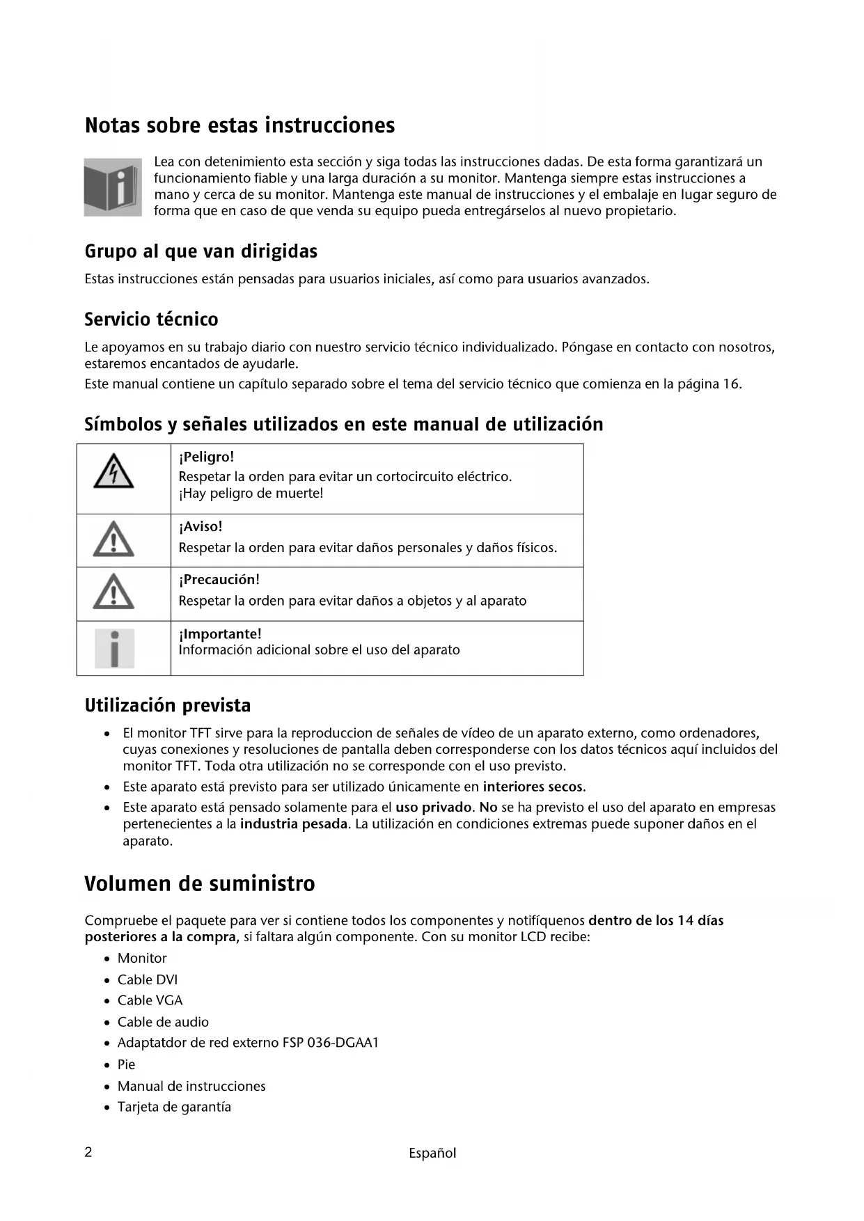 Notas sobre estas instrucciones Lea con detenimiento esta sección y siga todas las instrucciones dadas. De esta forma garantizará un funcionamiento fiable y una larga duración a su monitor. Mantenga siempre estas instrucciones a mano y cerca de su monitor. Mantenga este manual de instrucciones y el embalaje en lugar seguro de forma que en caso de que venda su equipo pueda entregárselos al nuevo propietario. Grupo al que van dirigidas Estas instrucciones están pensadas para usuarios iniciales, así como para usuarios avanzados. Servicio técnico Le apoyamos en su trabajo diario con nuestro servicio técnico individualizado. Póngase en contacto con nosotros, estaremos encantados de ayudarle. Este manual contiene un capítulo separado sobre el tema del servicio técnico que comienza en la página 16. Símbolos y señales utilizados en este manual de utilización ¡Peligro! Respetar la orden para evitar un cortocircuito eléctrico. ¡Hay peligro de muerte! ¡Aviso! Respetar la orden para evitar daños personales y daños físicos. ¡Precaución! Respetar la orden para evitar daños a objetos y al aparato ¡Importante! Información adicional sobre el uso del aparato Utilización prevista El monitor TFT sirve para la reproduccion de señales de vídeo de un aparato externo, como ordenadores, cuyas conexiones y resoluciones de pantalla deben corresponderse con los datos técnicos aquí incluidos del monitor TFT. Toda otra utilización no se corresponde con el uso previsto. Este aparato está previsto para ser utilizado únicamente en interiores secos. Este aparato está pensado solamente para el uso privado. No se ha previsto el uso del aparato en empresas pertenecientes a la industria pesada. La utilización en condiciones extremas puede suponer daños en el aparato. Volumen de suministro Compruebe el paquete para ver si contiene todos los componentes y notifíquenos dentro de los 14 días posteriores a la compra, si faltara algún componente. Con su monitor LCD recibe: Monitor Cable DVI Cable VGA Cable de audio Adaptatdor de red externo FSP 036-DGAA1 Pie Manual de instrucciones Tarjeta de garantíaInstrucciones de seguridad