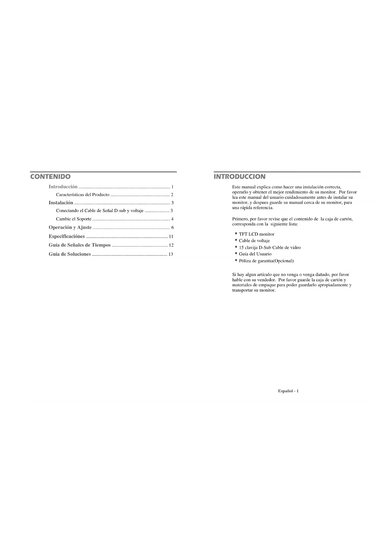 - Póliza de garantia(Opcional) Si hay algun artículo que no venga o venga dañado, por favor hable con su vendedor. Por favor guarde la caja de cartón y materiales de empaque para poder guardarlo apropiadamente y transportar su monitor. Español - 1 CONTENIDO INTRODUCCIONCONECTANDO EL CABLE DE SEÑAL D-SUB Y VOLTAJE