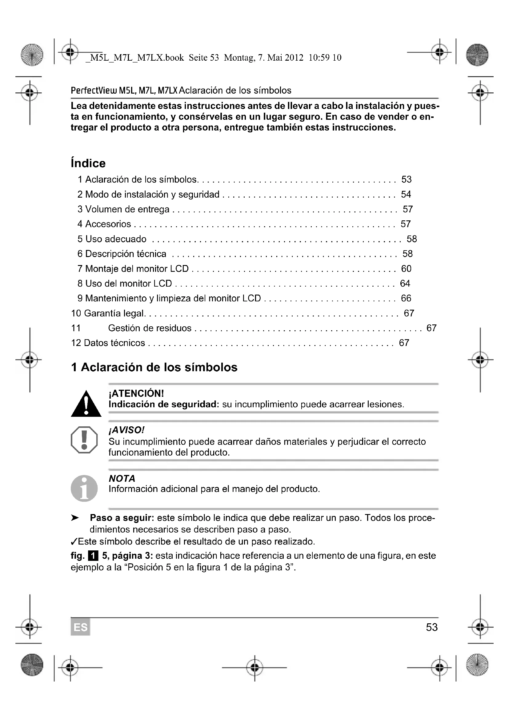 NOTA Información adicional para el manejo del producto. ➤ Paso a seguir: este símbolo le indica que debe realizar un paso. Todos los proce- dimientos necesarios se describen paso a paso. ✓ Este símbolo describe el resultado de un paso realizado. fig. 1 5, página 3: esta indicación hace referencia a un elemento de una figura, en este ejemplo a la “Posición 5 en la figura 1 de la página 3”. _M5L_M7L_M7LX.book Seite 53 Montag, 7. Mai 2012 10:59 10Modo de instalación y seguridad PerfectView M5L, M7L, M7LX