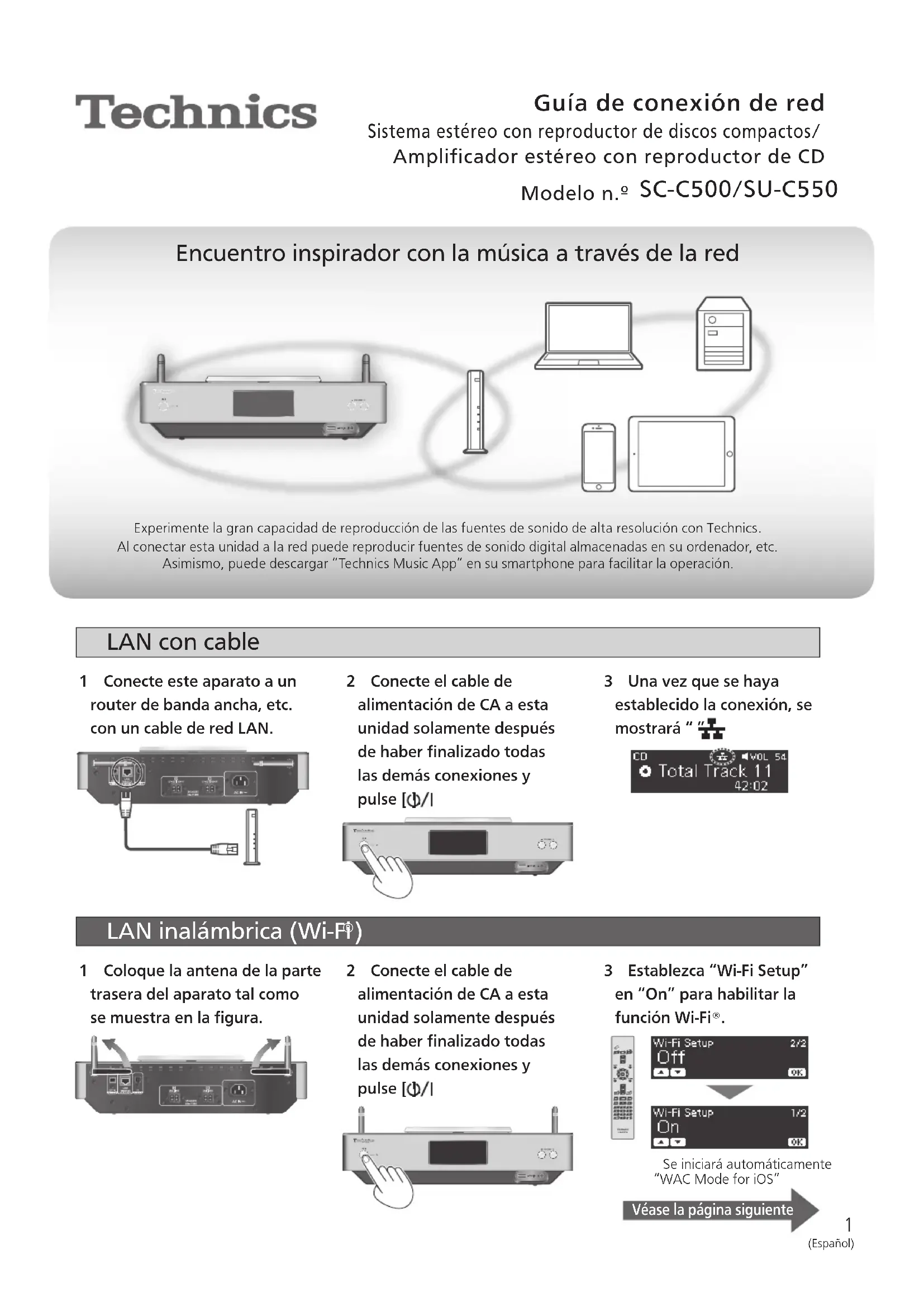 Amplificador estéreo con reproductor de CD Modelo n.º SC-C500/SU-C550 Encuentro inspirador con la música a través de la red Experimente la gran capacidad de reproducción de las fuentes de sonido de alta resolución con Technics. Al conectar esta unidad a la red puede reproducir fuentes de sonido digital almacenadas en su ordenador, etc. Asimismo, puede descargar “Technics Music App” en su smartphone para facilitar la operación. LAN con cable 1 Conecte este aparato a un router de banda ancha, etc. con un cable de red LAN. 2 Conecte el cable de alimentación de CA a esta unidad solamente después de haber finalizado todas las demás conexiones y pulse [ ]. 3 Una vez que se haya establecido la conexión, se mostrará “ ”.