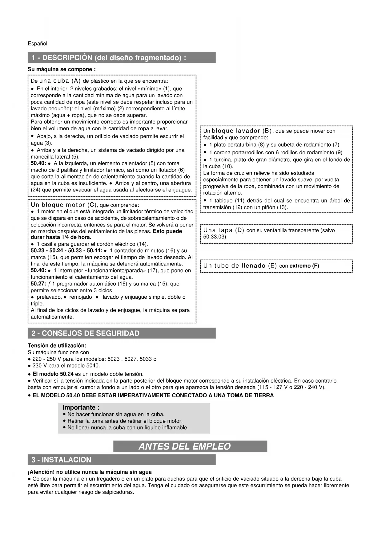 Modelo 50.23 - 50.24 - 50.33 - 50.40 - Regule su tiempo de lavado llevando la cifra del contador de minutos correspondiente al número de minutos escogidos, frente a la marca del contador de minutos (15). - Su máquina se parará automáticamente pasado el tiempo de funcionamiento. Usted no tiene que preocuparse por el tiempo que pasa, pero es preferible no dejar su máquina sin ninguna supervisión. - Asegúrese que nada interrumpe el buen funcionamiento del bloque lavador hasta que oiga el clip del contador de minutos que para automáticamente el motor.