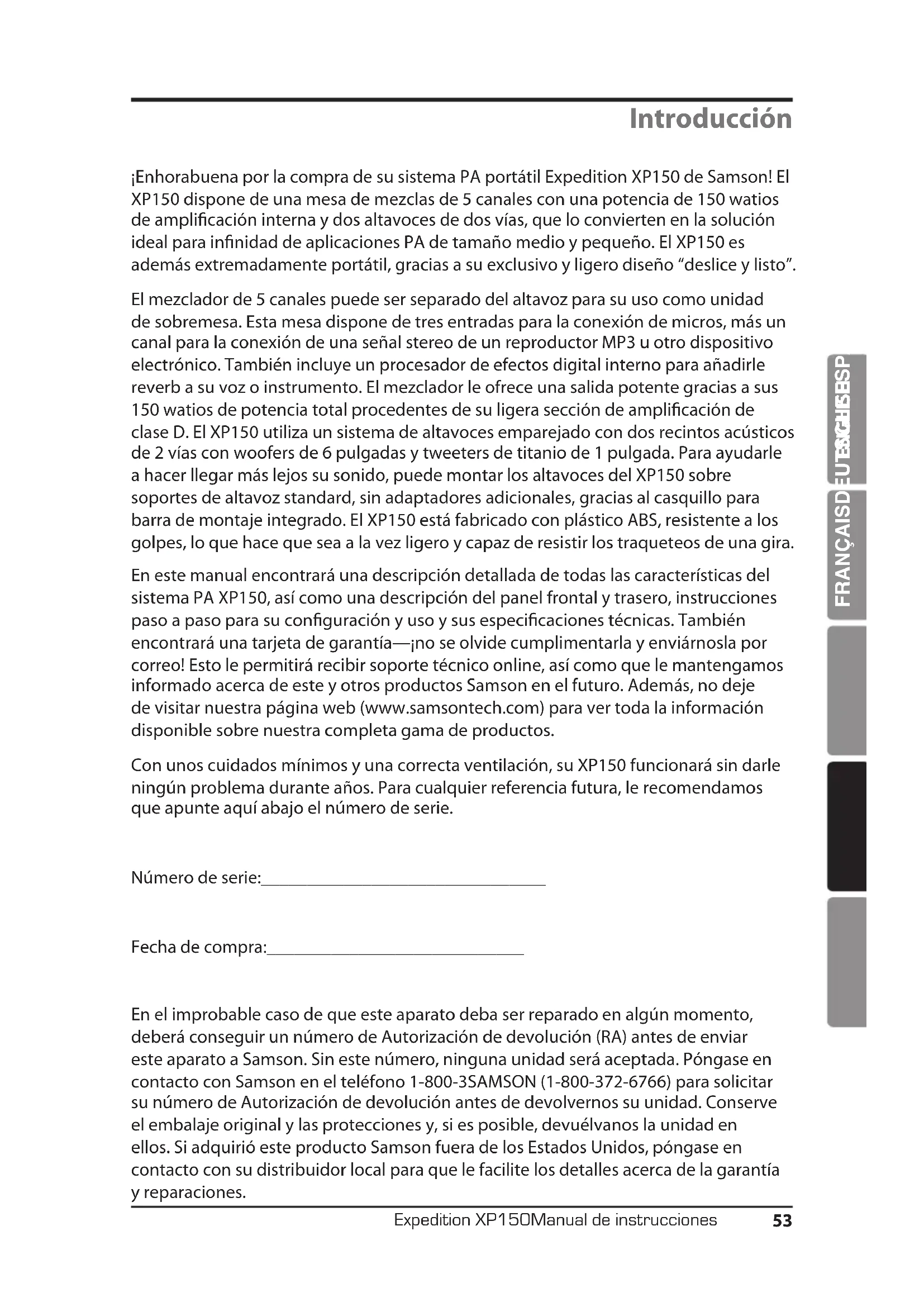 En este manual encontrará una descripción detallada de todas las característica del sistema PA XP150, asi como una descripción del panel frontal y trasero, instructaciones bajo el caso. Para su configuración y uso y sus espécificacioneséticas. Tembloarayearuna tarjeta de garantía—no se olvide complimentarla y enviárnosla por correo! Este le permitiráreb恭喜o online, asi como que le mantengamos informado acerca de este yotiros products Samson en el futuro. Además, no deje de visitar notrestra网页 (www.samsontech.com) para ver toda la información disponible sobre notrestracomplete gama de produits.
